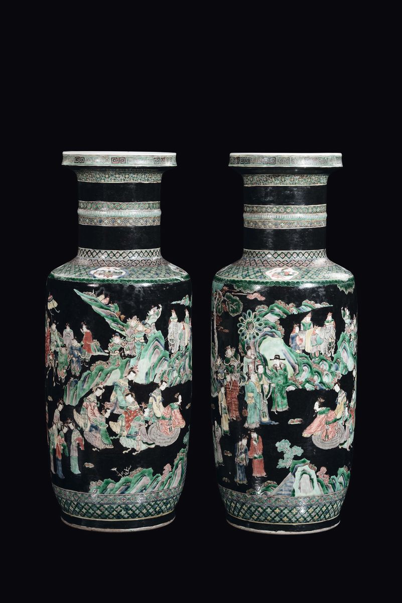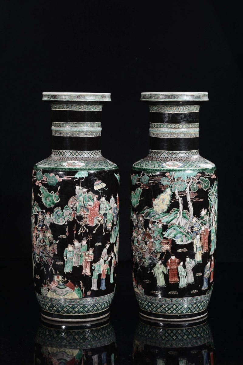 A pair of large porcelain vases in the color of Famille Verte with warriors and dignitaries decorations, China, Qing Dynasty, [..]