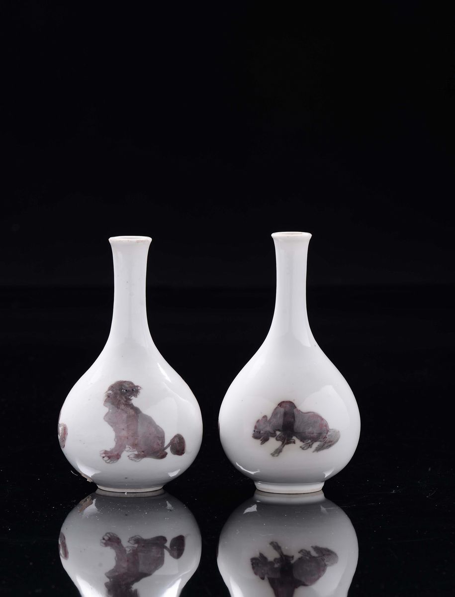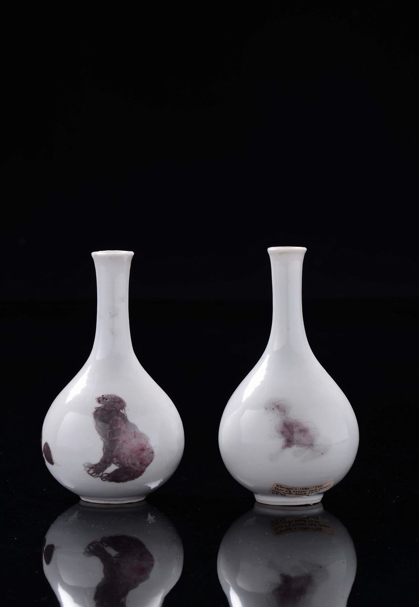 A pair of polychrome porcelain ampoules with red fantastic animals, China, Qing Dynasty, Kangxi Period (1662-1722)