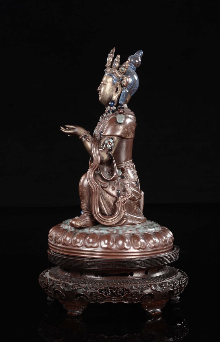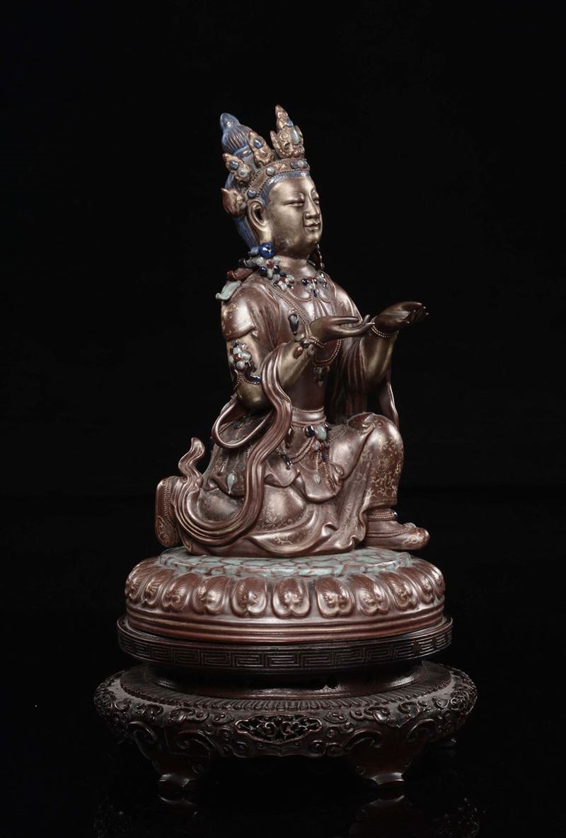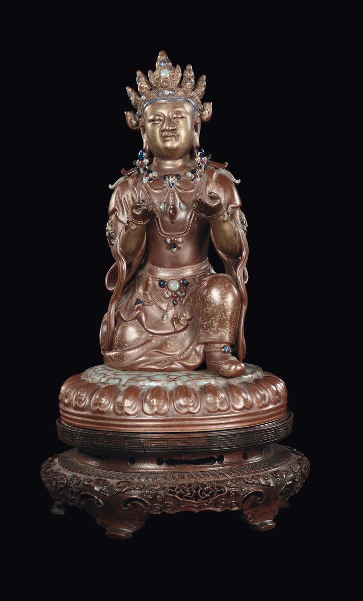 Buddha incoronato e adornato da gioielli a perline in atto reverenziale.h cm 31