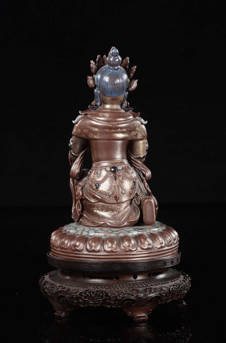 A polychrome porcelain kneeling Buddha, China, Qing Dynasty