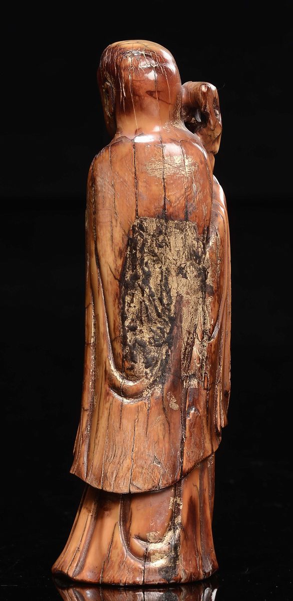 A semi-gilt lacquered ivory wise man with stick figure, China, Ming Dynasty, 17th century