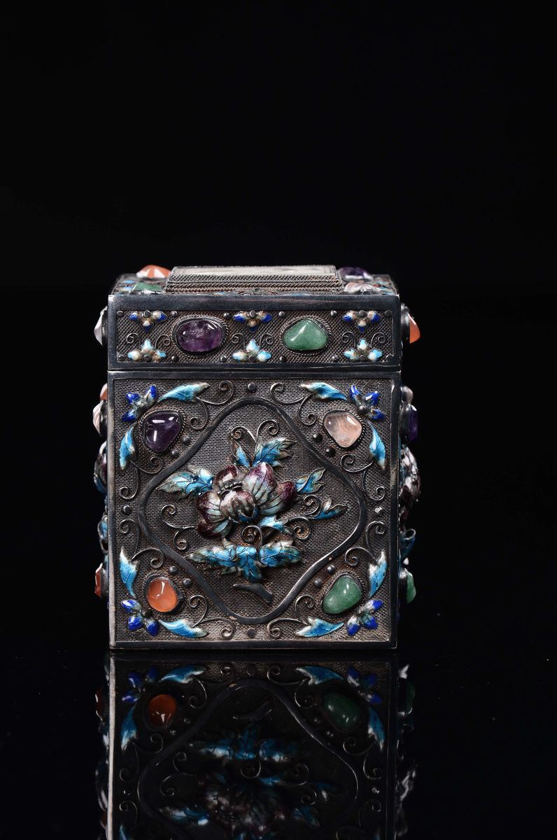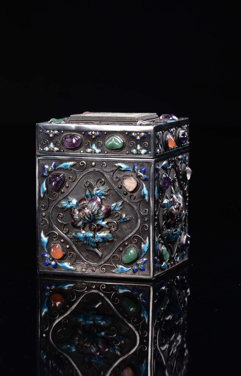 A silver and cloisonné glazed box and cover with a white jade fretworked phoenix plaque, China, Qing Dynasty, 19th centur [..]