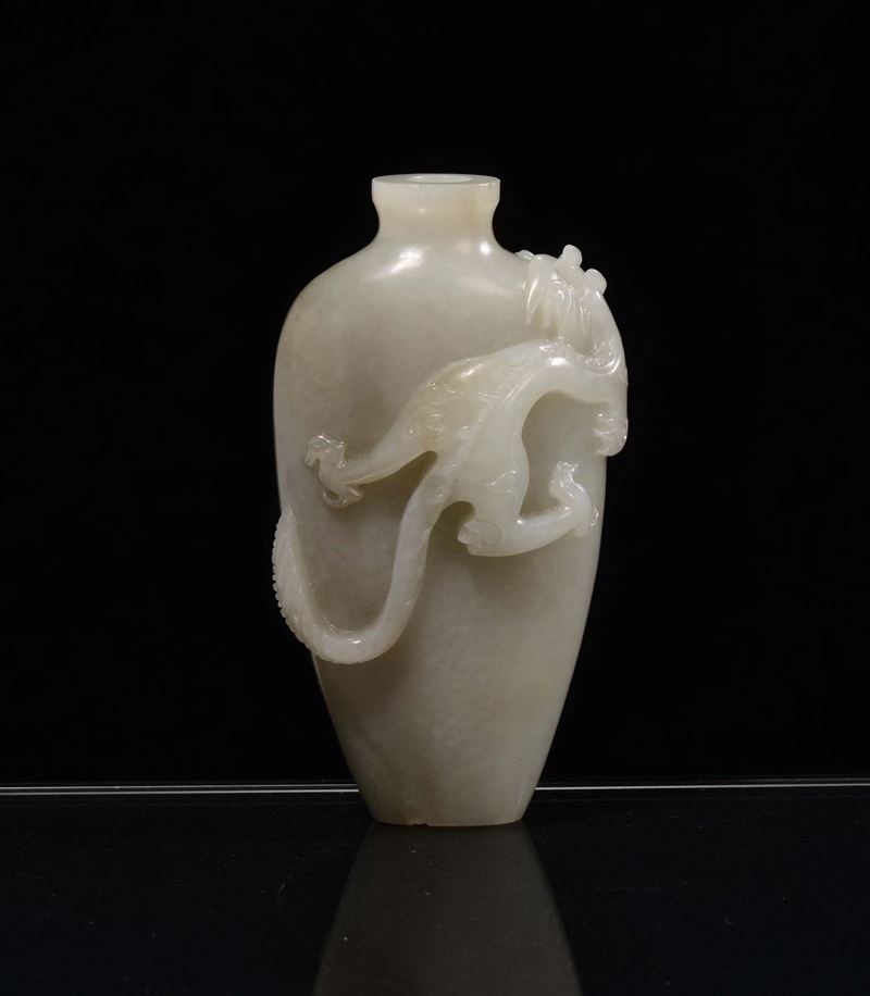 A small Celadon white jade snuff bottle with dragon in relief, China, Qing Dynasty, Qianlong Period (1736-1795)