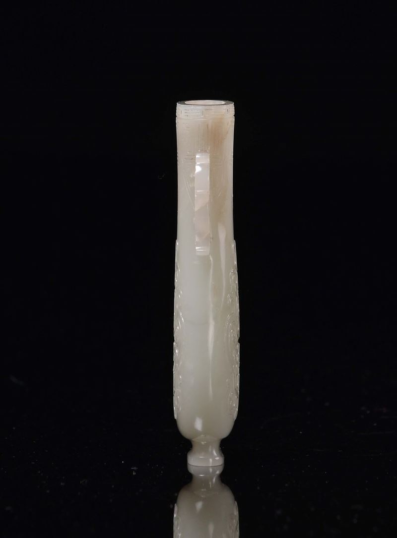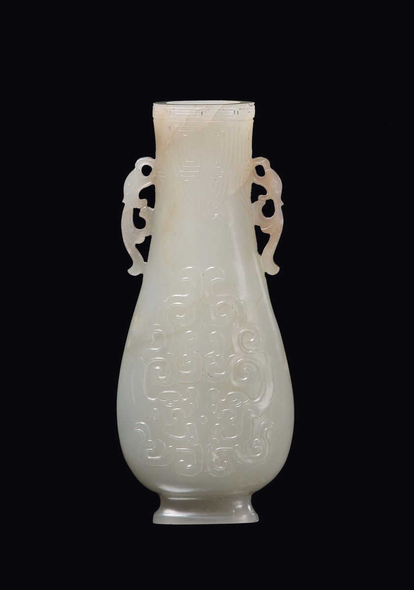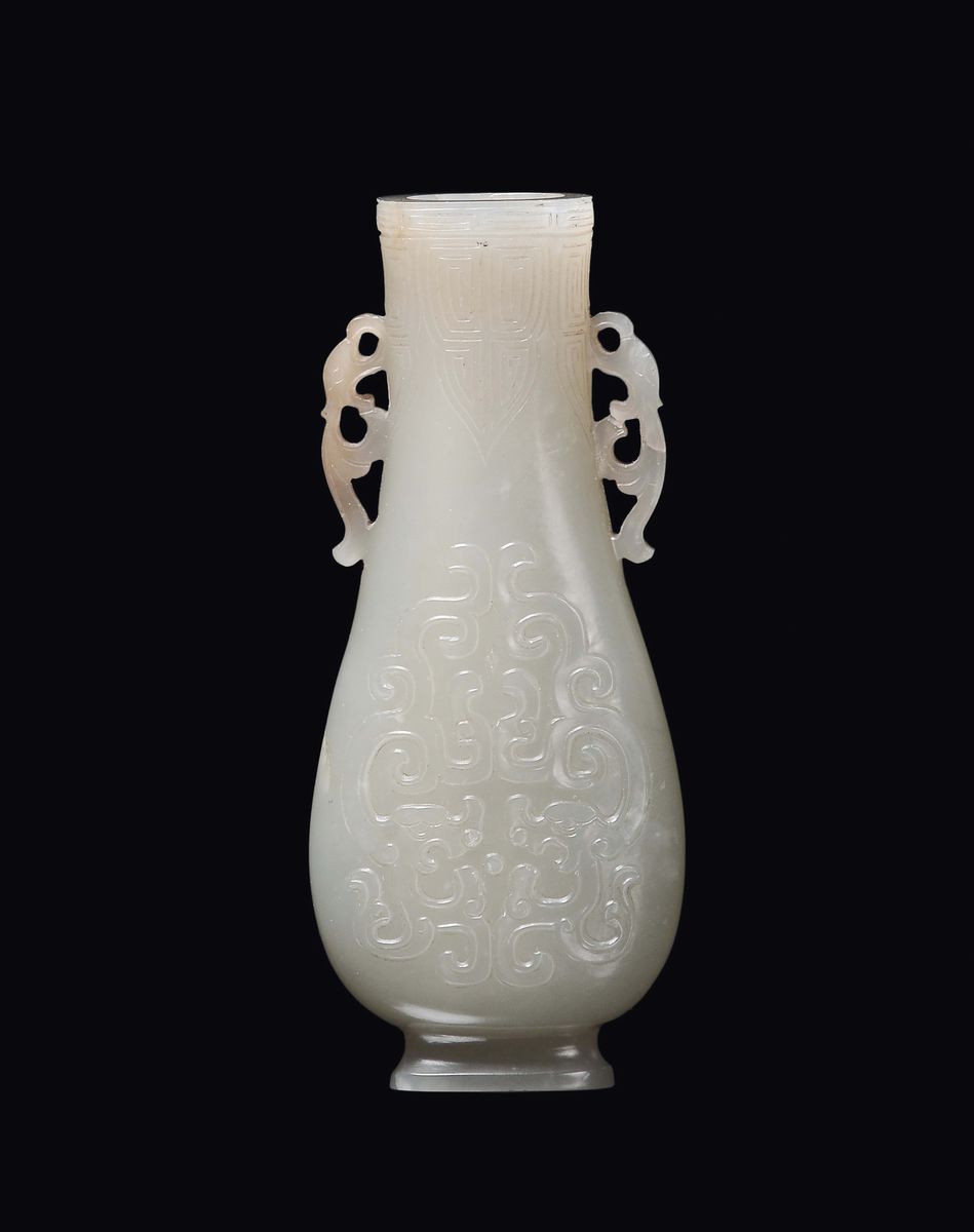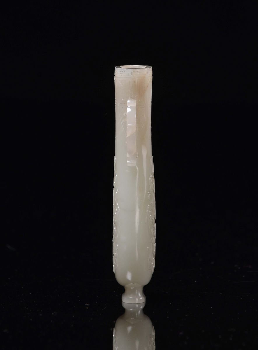 A small white jade vase double handle carved with geometric motives in archaic style, China, Dinastia Qing, 19th century