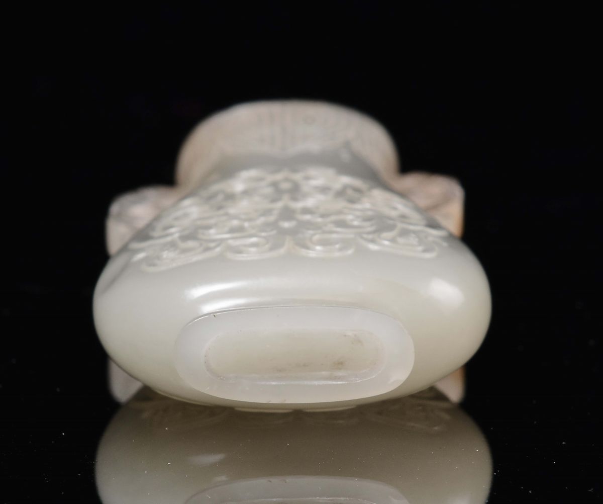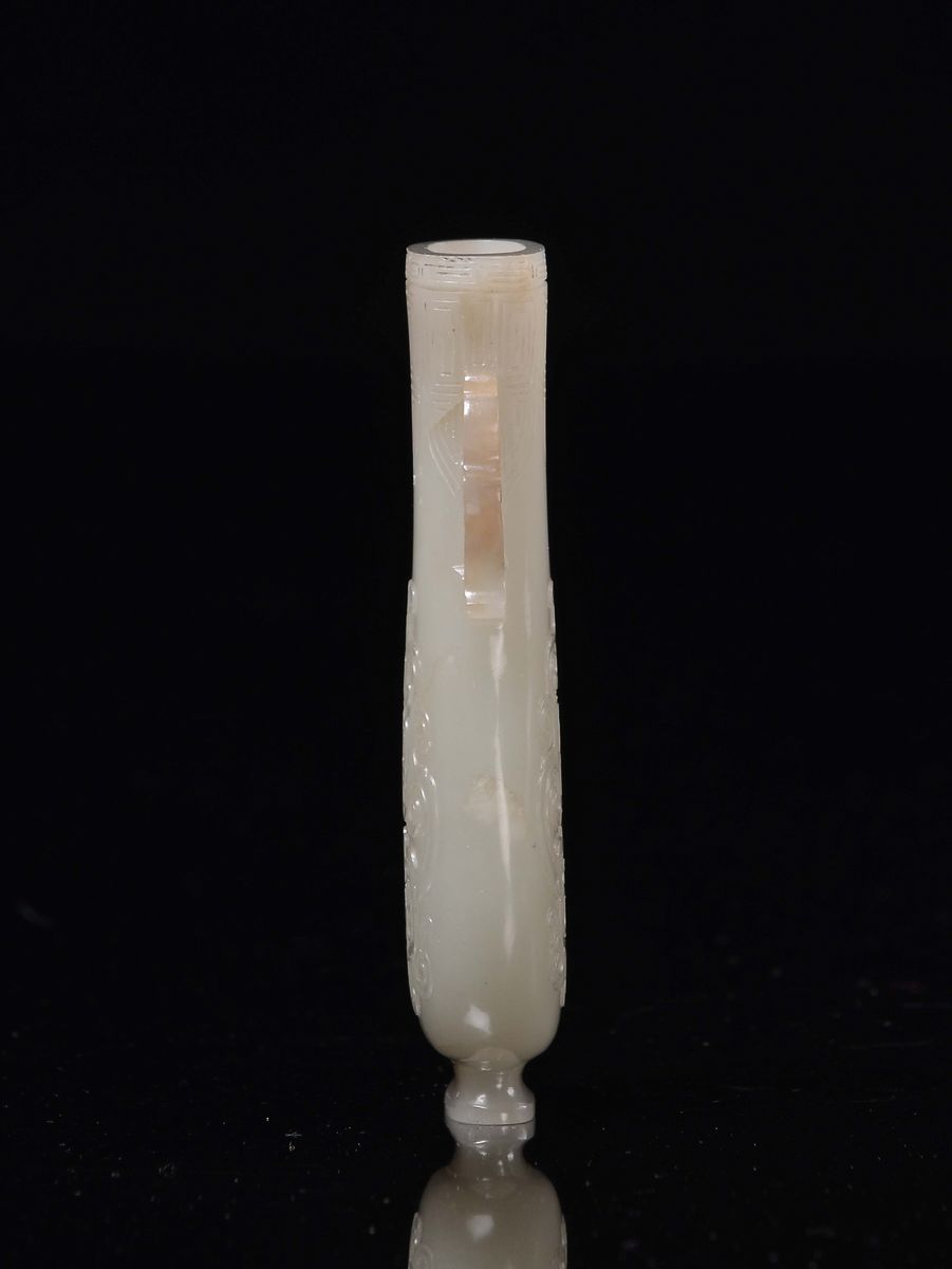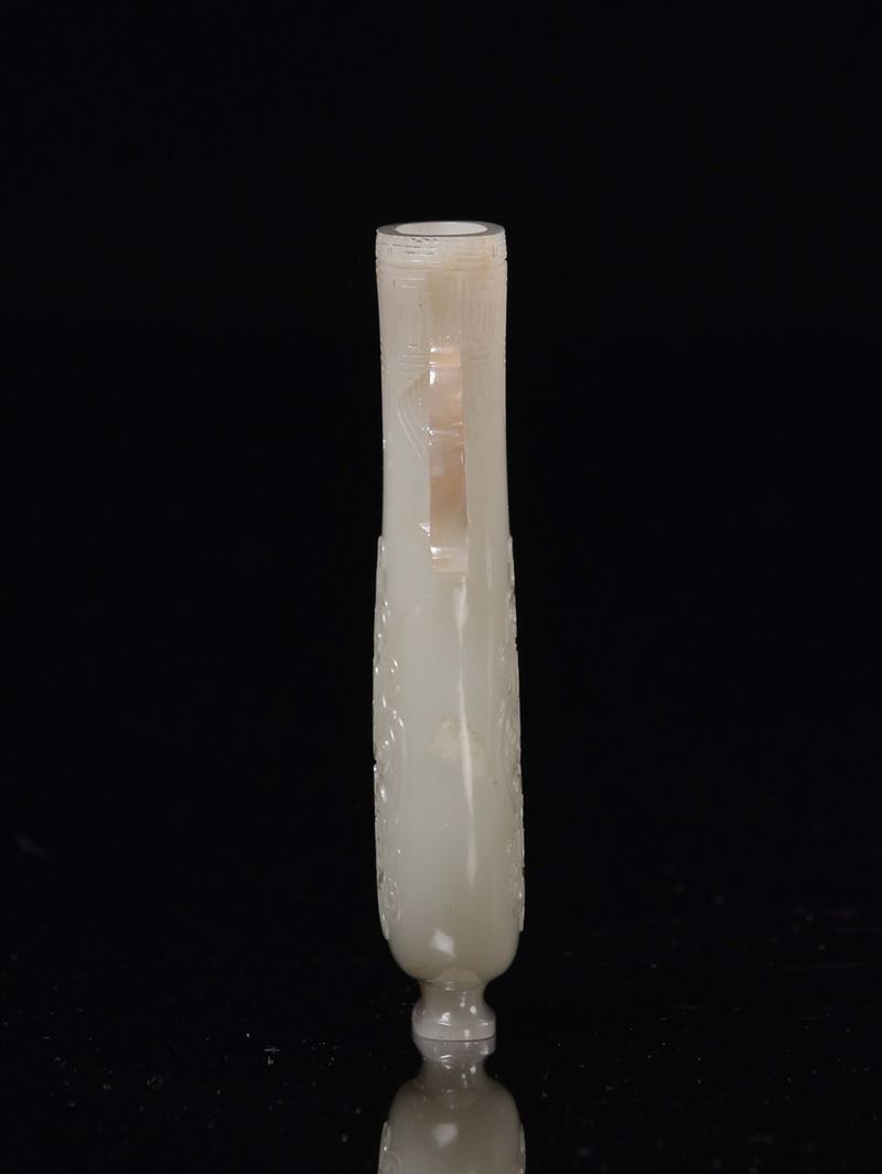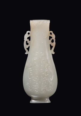 A small white jade vase double handle carved with geometric motives in archaic style, China, Dinastia Qing, 19th century