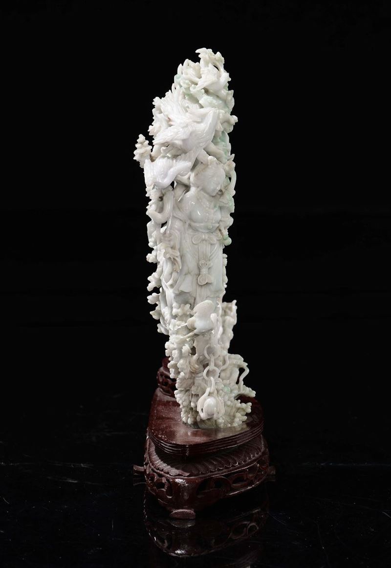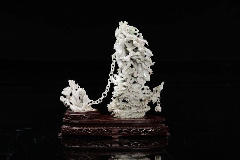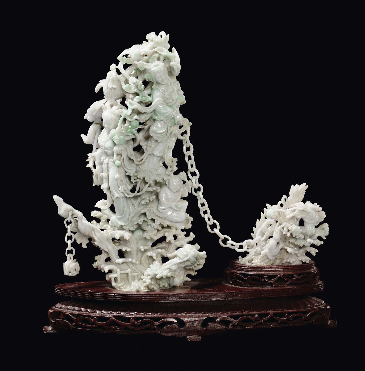 A white and aplle green jadeite Guanyin and birds group connected with chain, China, Republic, 20th century
