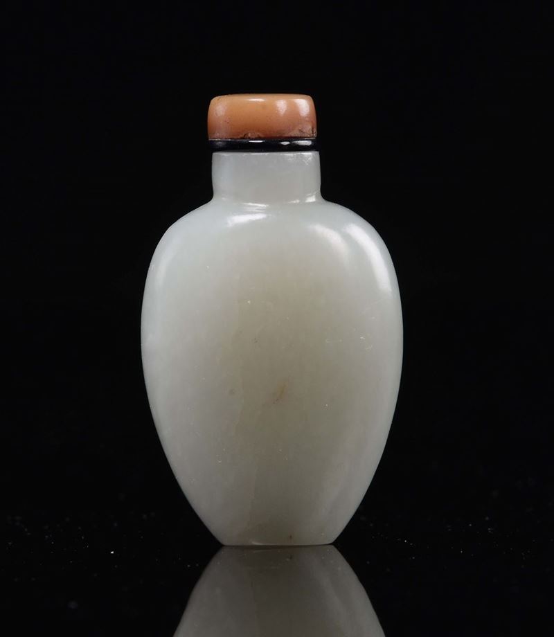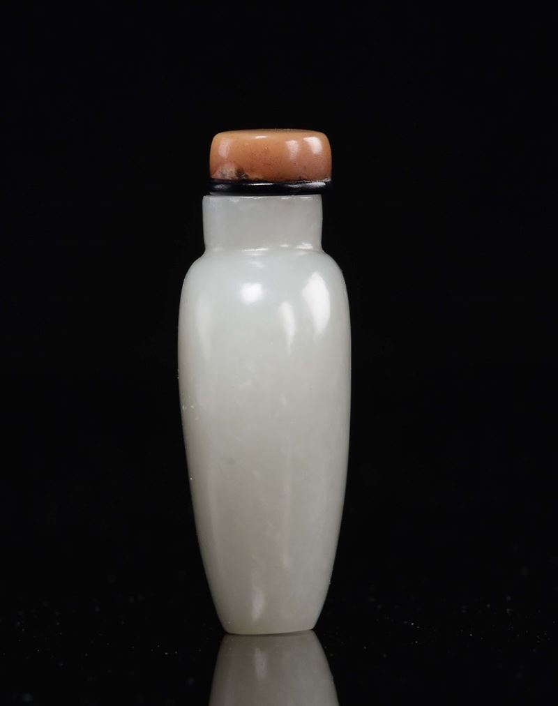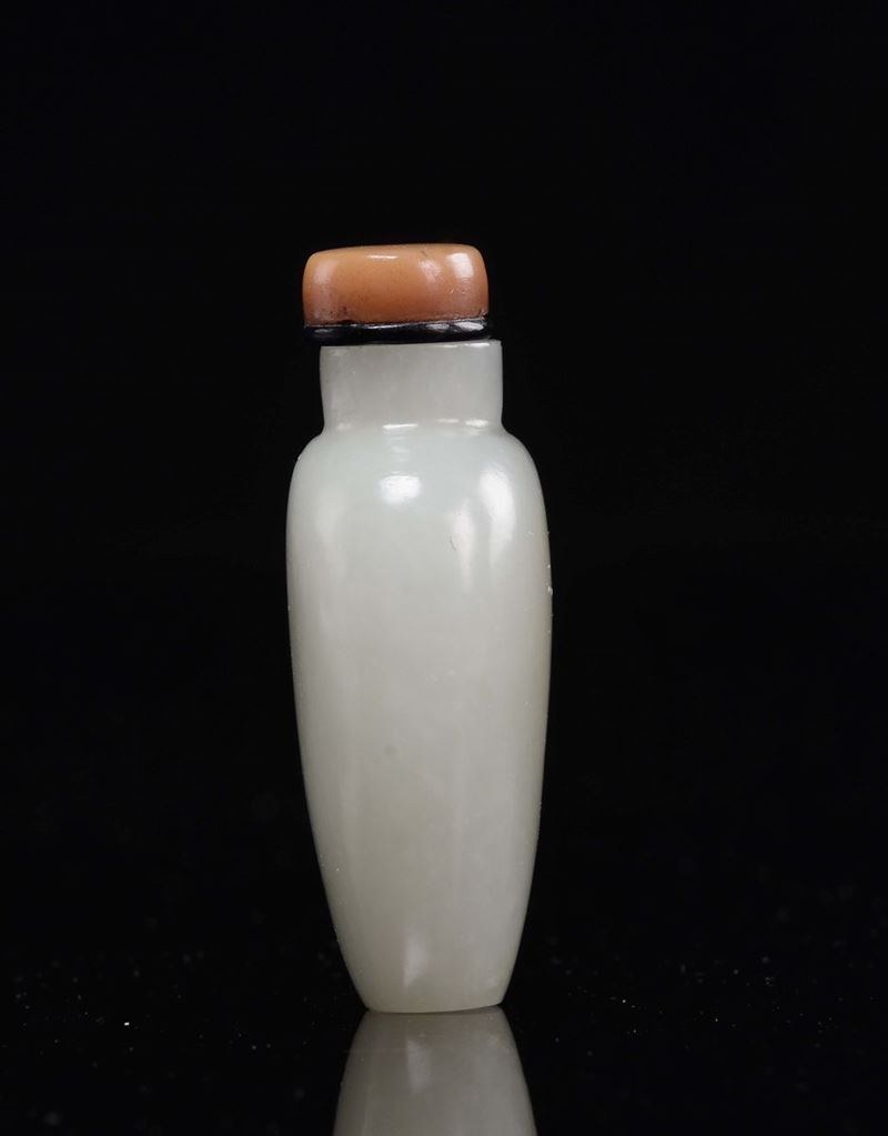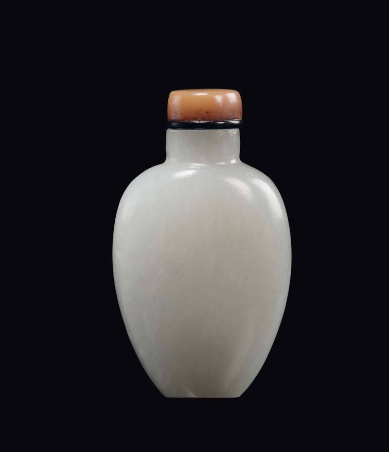 A white and grey jade snuff bottle with carnelian stopper, China, Qing Dynasty, Qianlong Period (1736-1735)