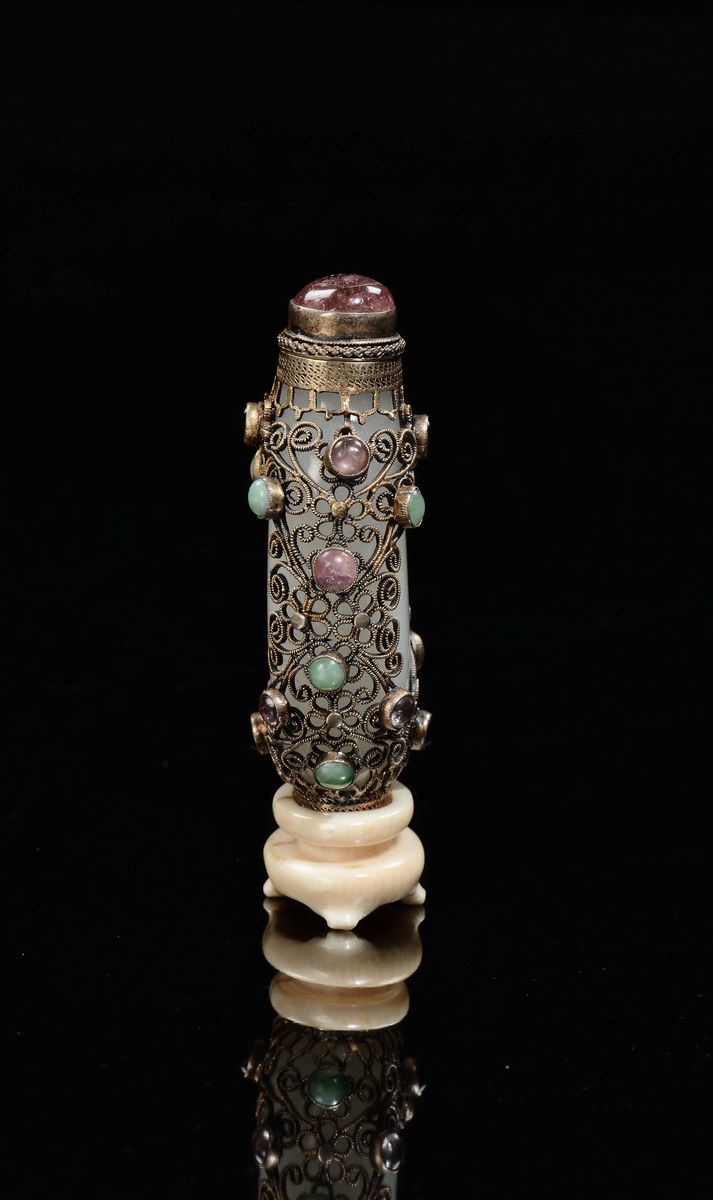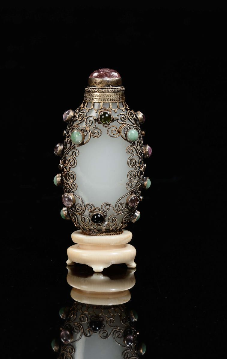 A white jade snuff bottle with silver and semiprecious stones setting on ivory base, China, Qing Dynasty, 19th century
