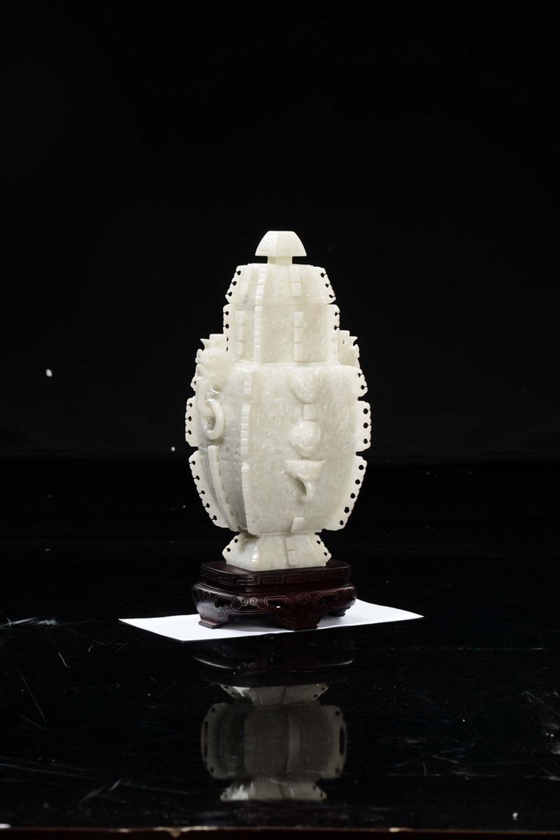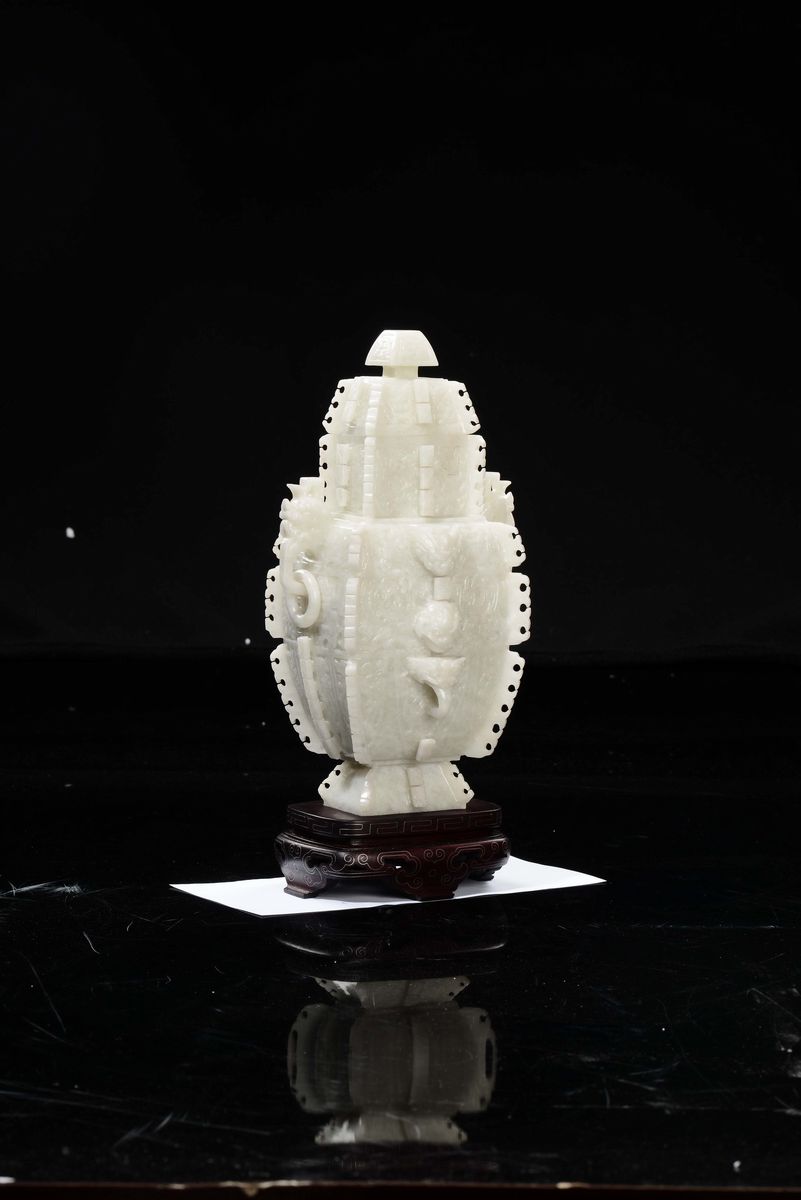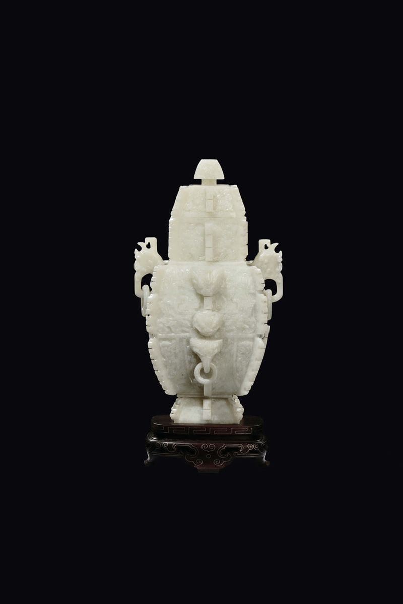 A white jade vase with lid double handles with archaic form and decoration, China, early 20th century
