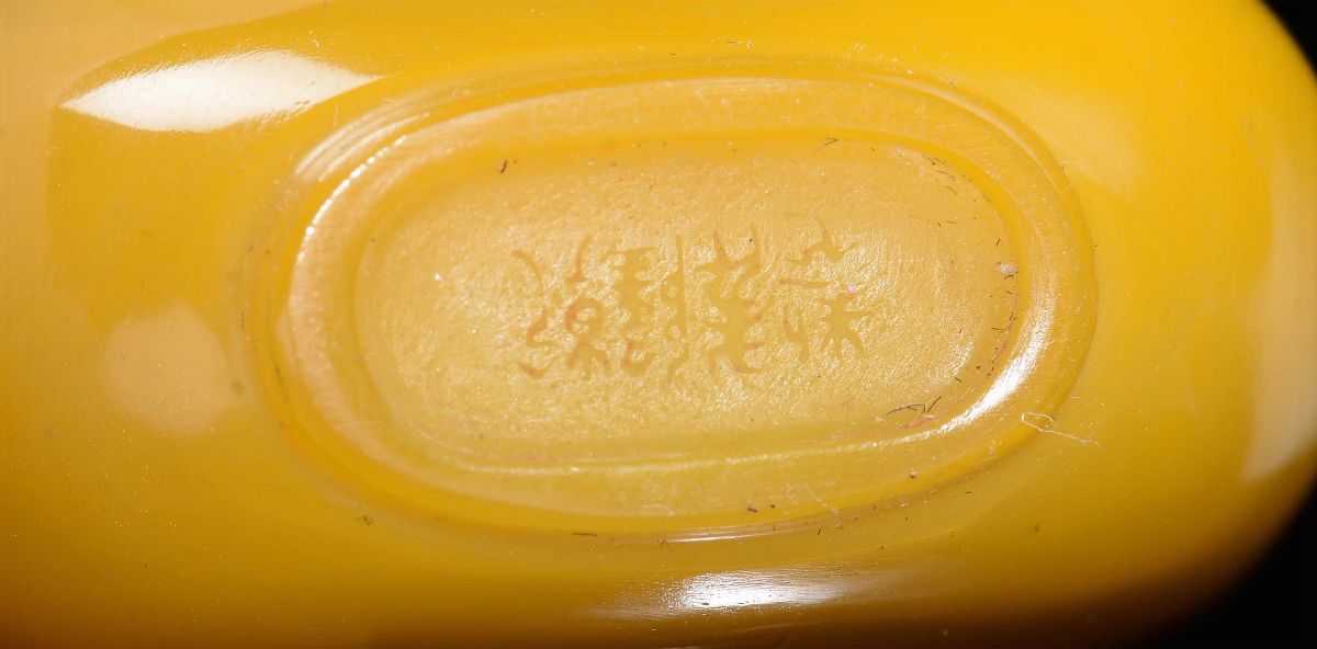 A yellow glass snuff bottle with white jade stopper, China, Qing, Dynasty, 19th century