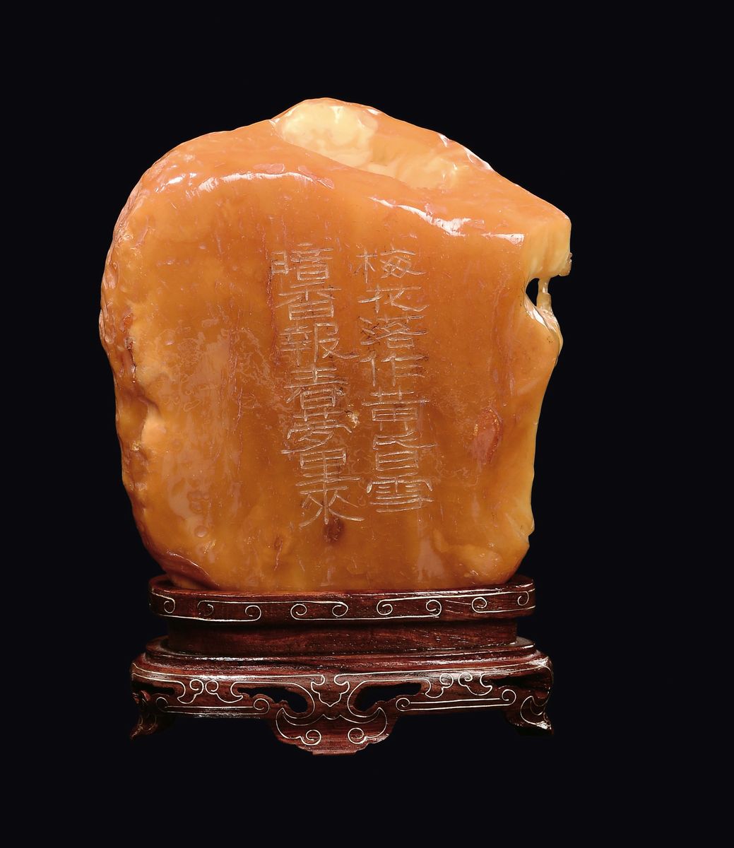 An amber mountain ink holder with peach flowers engraved, China, Qing Dynasty, 19th century