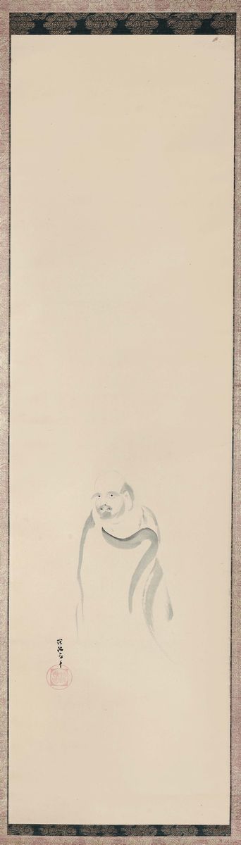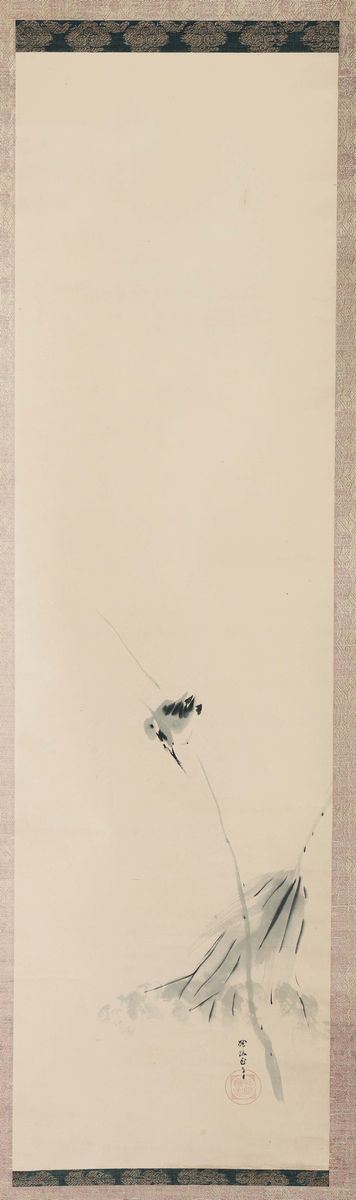 Three signed scroll enclosed in a wooden case, depicting a wise man, a woodpecker and a titmouse sitting on a branch, Japan, [..]