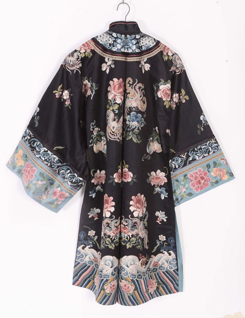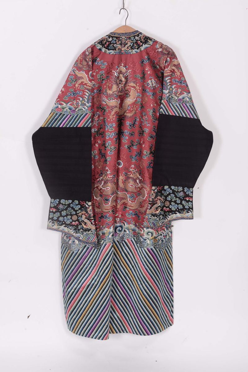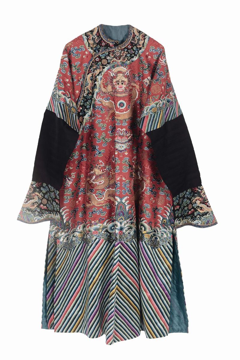Two silk dresseses one with floral embroidery and one red-ground with gold dragons, China, Qing Dynasty, 19th century