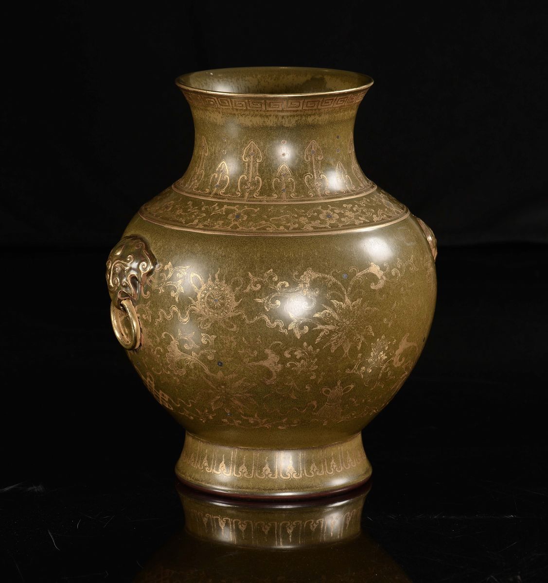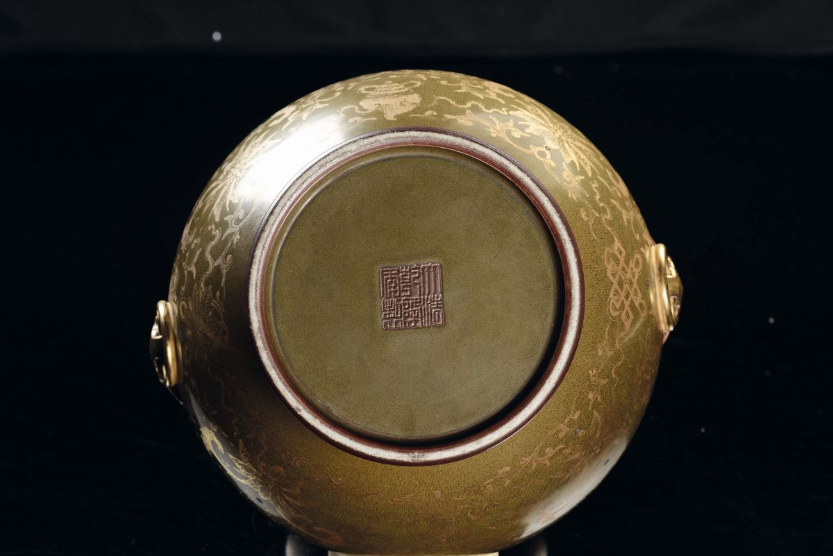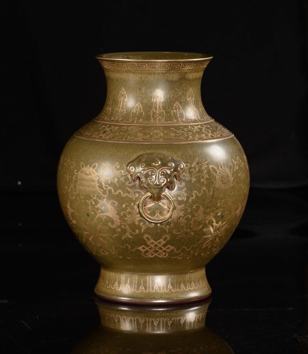 Vaso in porcellana a fondo verde con decoro dorato, Cina, Dinastia Qing, Marca e del Periodo Qianlong (1736-1795)