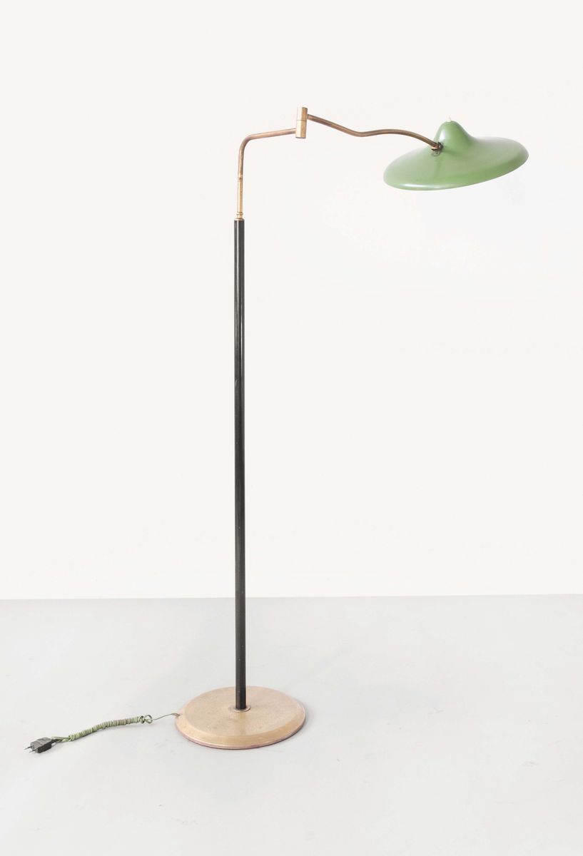 Lampada da terra in ottone lucido e metallo verniciato. Diffusore in alluminio laccato, Prod. Arredoluce, 1950.Cm 145x83x40