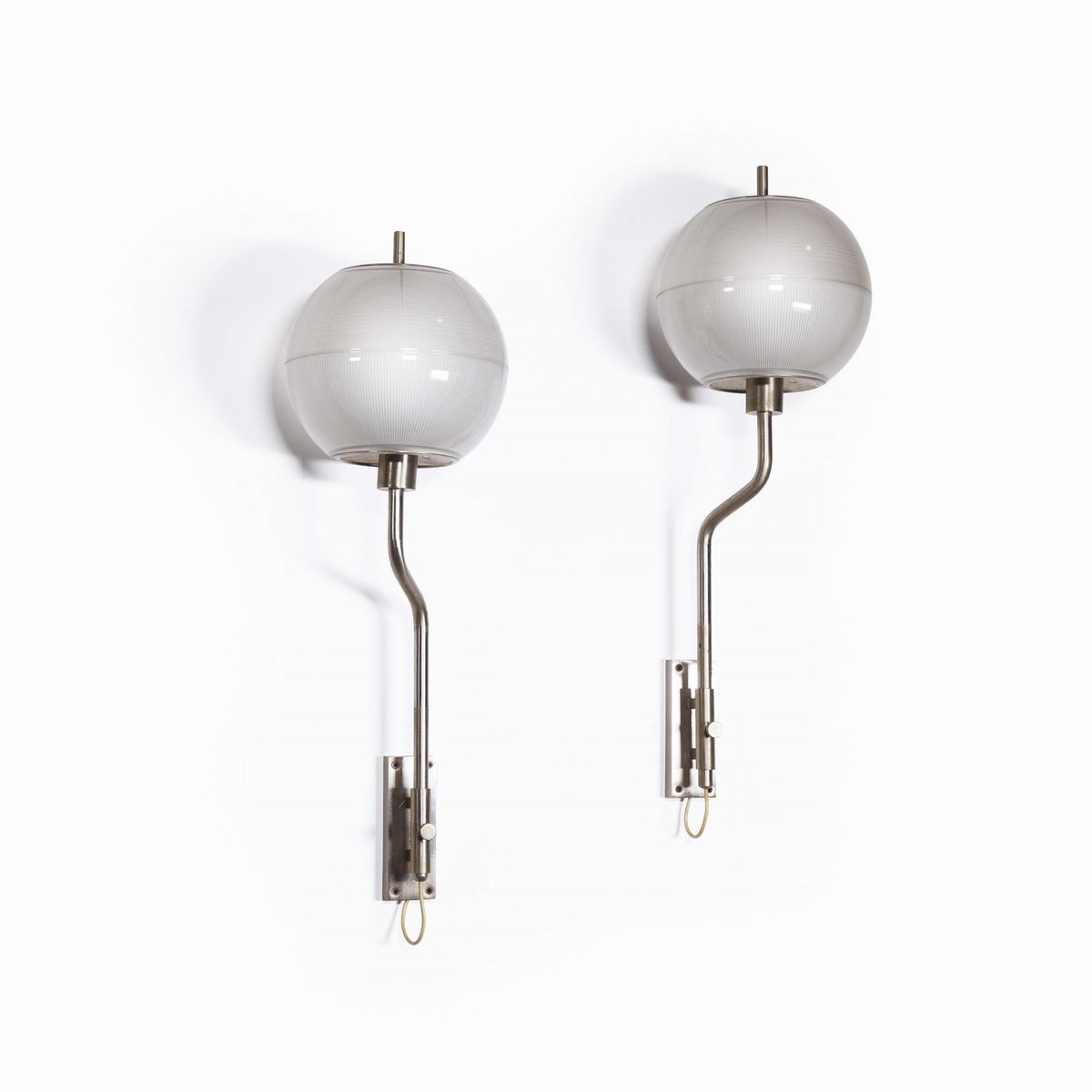 Quattro lampade da parete in ottone nichelato e diffusore in vetro stampato, Italia 1960, cm 80x26x30