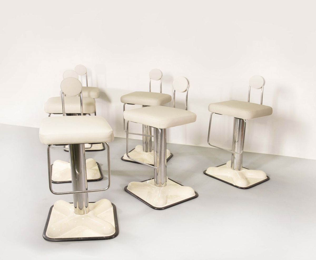 Sei sgabelli con base in fibra di vetro e colonna in acciaio.Prod. Zanotta 1971. cm 44x47x105