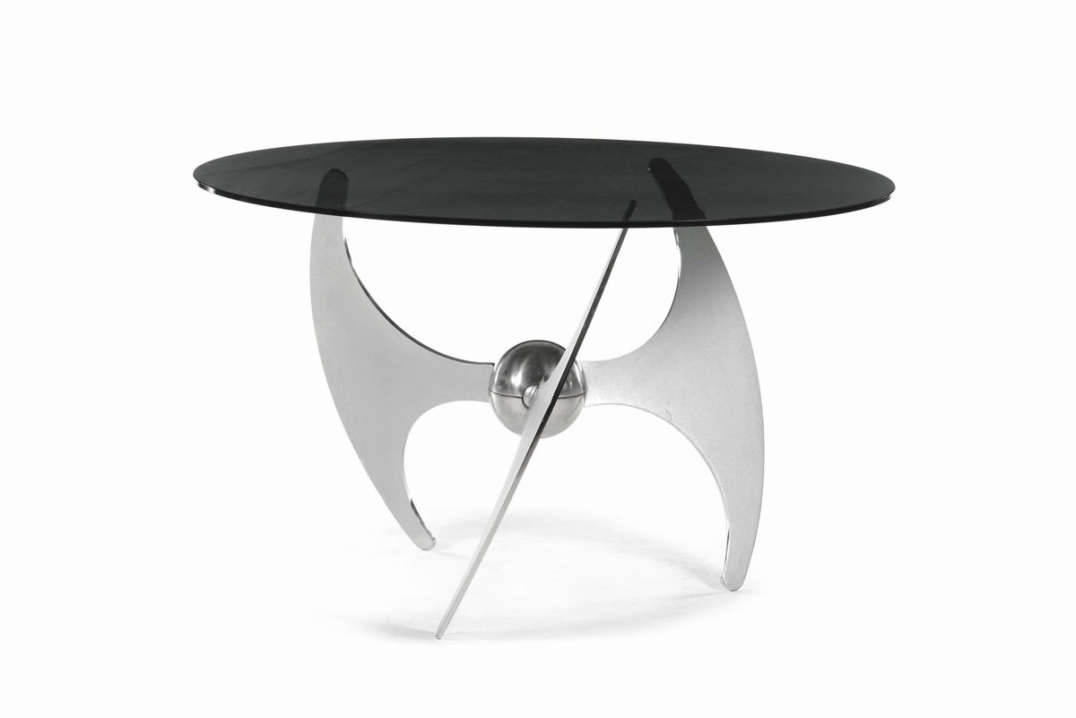 T+T tavolo regolabile in altezzaBasamento in acciaio cromato, piano in cristalloProd. Cama 1970 Ca. altezza cm 78, diametro cm 126