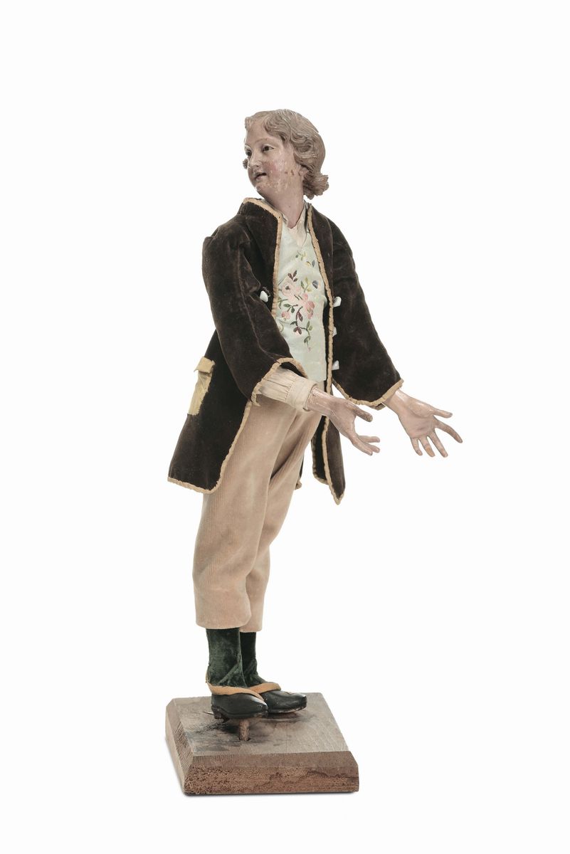 manichino in legno articolato, occhi di vetro, vestitura originale, altezza cm 39,5