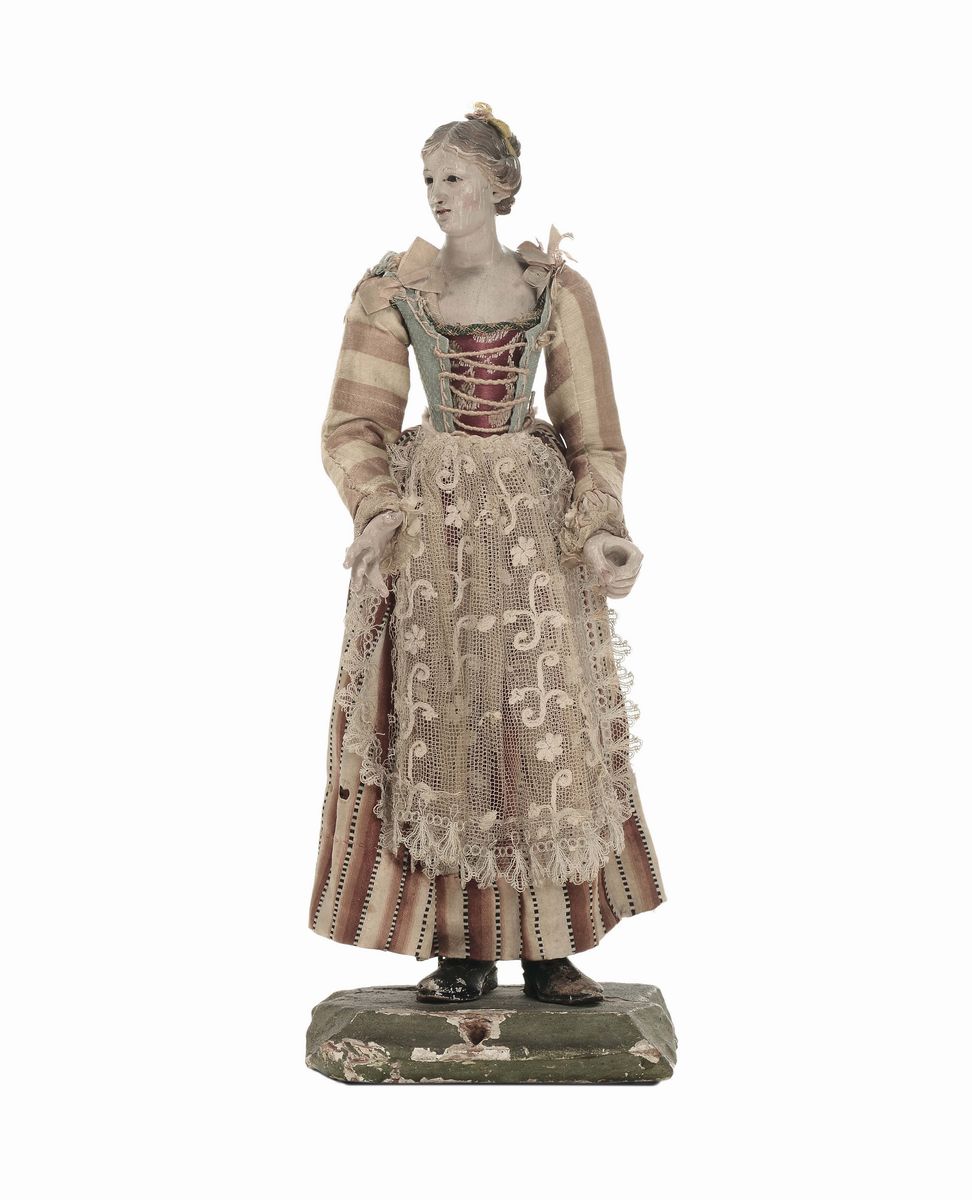 manichino in legno articolato, occhi di vetro, vestitura originale, altezza cm 28,5