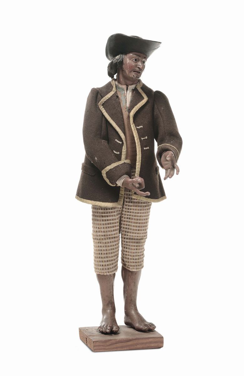 manichino in legno articolato, occhi di vetro, vestitura originale, altezza cm 41