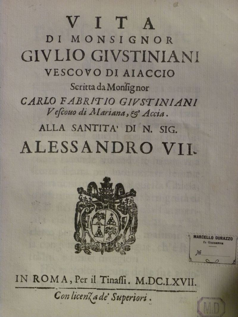 Carlo Fabritio Giustiniani Vita di Monsignor Giulio Giustiniani Vescovo di Aiaccio..