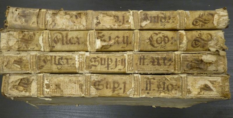 Prima et secunda pars commentarium... Super digesto novo, Lugduni, 1535. Legatura coeva in piena pergamena. /Prima et secunda pars... Super digesto veteri, 1535. Legatura coeva in piena pergamena rigida. / Prima et secunda pars commentarium... Super codice Iustiniano. 1535. Legatura coeva in piena pergamena rigida. Uno strappo riparabile alla carta 156. / Prima pars commentarium in secundam infortiati partem. 1535. Legatura coeva in piena pergamena rigida. Gravi difetti da umidità alle ultime carte con perdita di testo.