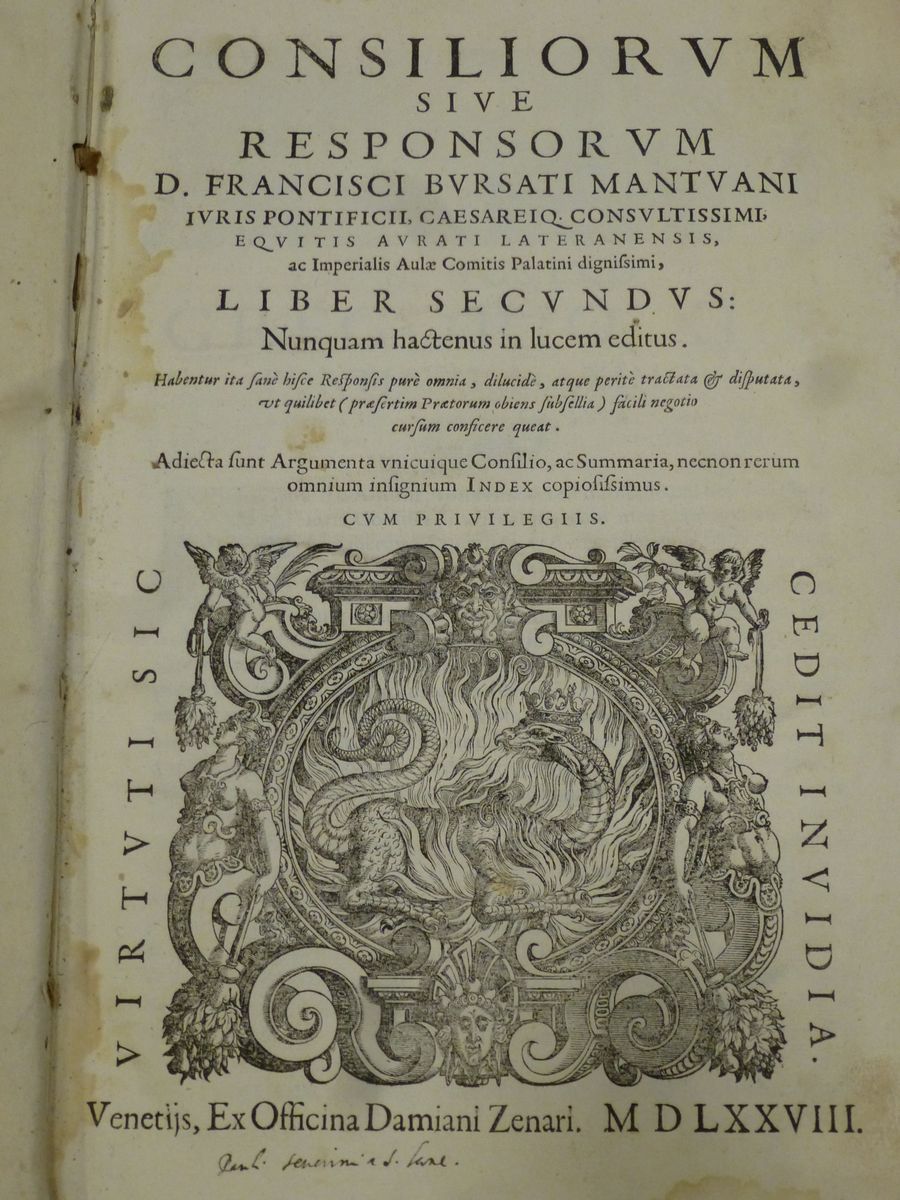 Consiliorum sive responsorum... Liber Secundus. Venetia, Damiani Zenari, 1578. Legatura coeva in piena pergamena. Difetti e carte staccate in fine. Unito a: Francisci Bursati, Consiliorum sive responsorum... Liber Tertium. Vemetia, Francisci de Franciscis, 1582. Legatura coeva in piena pergamena. Mancanze al dorso. Piatto posteriore staccato.