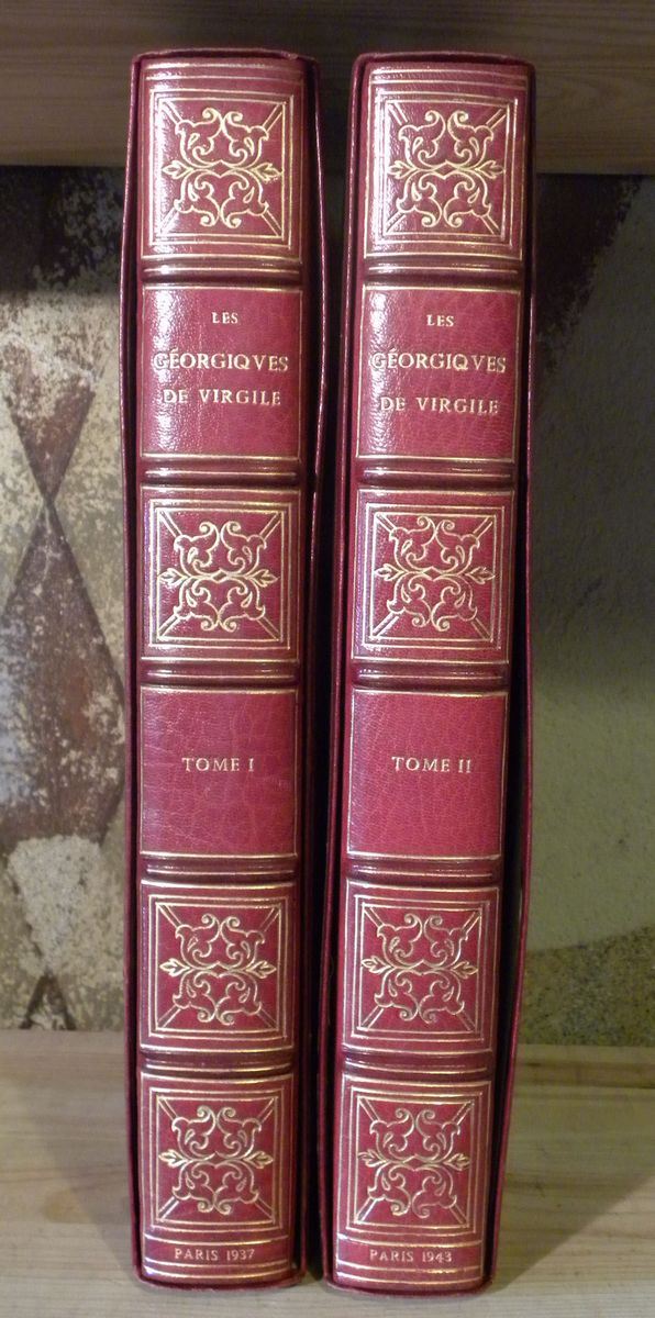 Paris,Philippe Gonin,1937-1943(1950).Due tomi.Sontuose legature italiane in piena pelle rossa,con ricche decorazioni in oro, eseguite da Gozzi a Modena. Qualche fioritura per altro bell'esemplare di questa magnifica edizione illustrata, nella tiratura di 100 esemplari, con la doppia suite di tavole,aggiunte in fine.