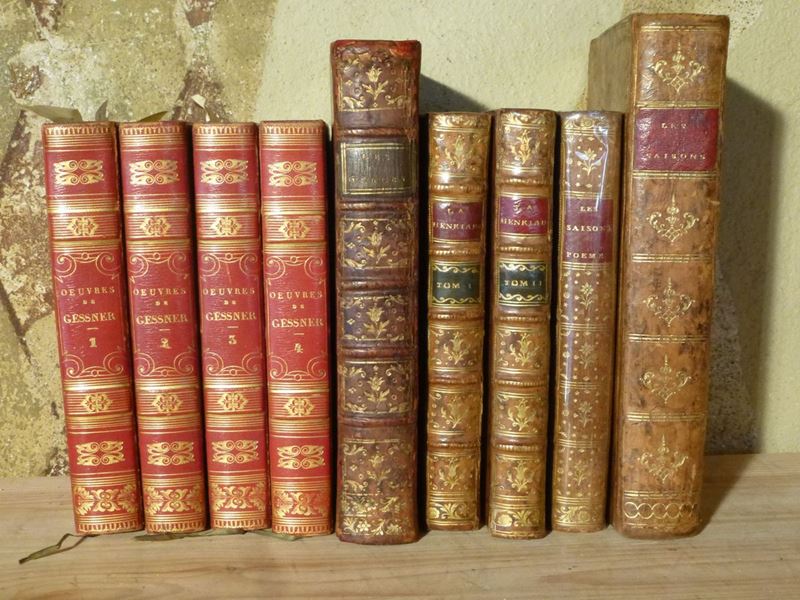 Paris,Prault et Bailly,1769. Legatura coeva in piena pelle: Si uniscono: Les Saisons, Poeme. Amsterdam,1775. Les Saisons, Poeme,Amsterdam,1769. La Henriade, Nouvelle Edition..Paris,Veuve Duchesne,s,d(1770). Due Volumi.Oeuvre de Salomon Gessner. Paris,Renouard,1799.Quattro tomi.