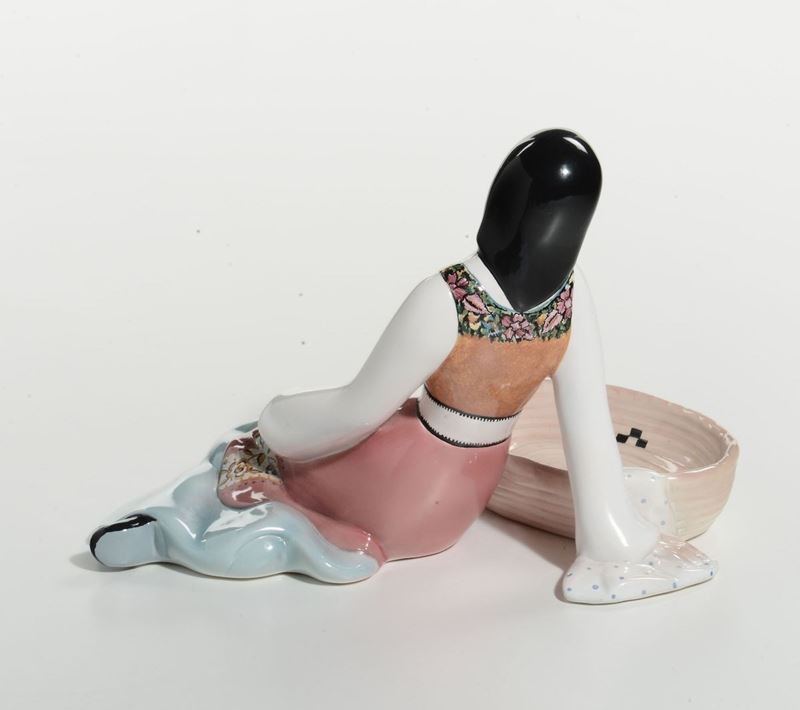 Gruppo in terracotta maiolicata decorata in policromia sotto vernice. Sotto la base marchio della manifattura, titolo e n. 376