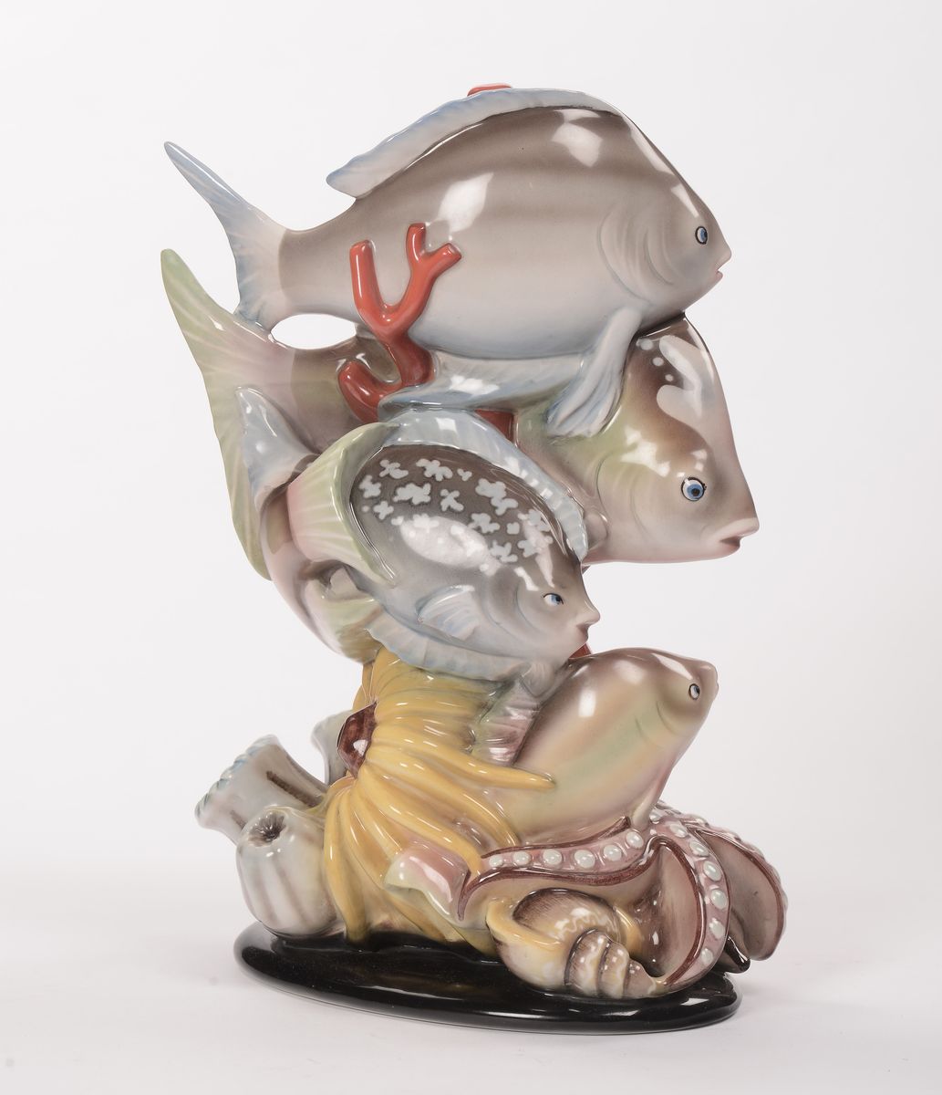 Terracotta maiolicata modellata a colaggio e decorata in policromia. Sotto la base marchio della manifattura e titolo. Altezza cm 31