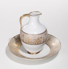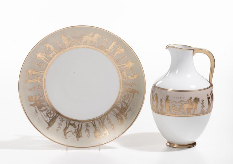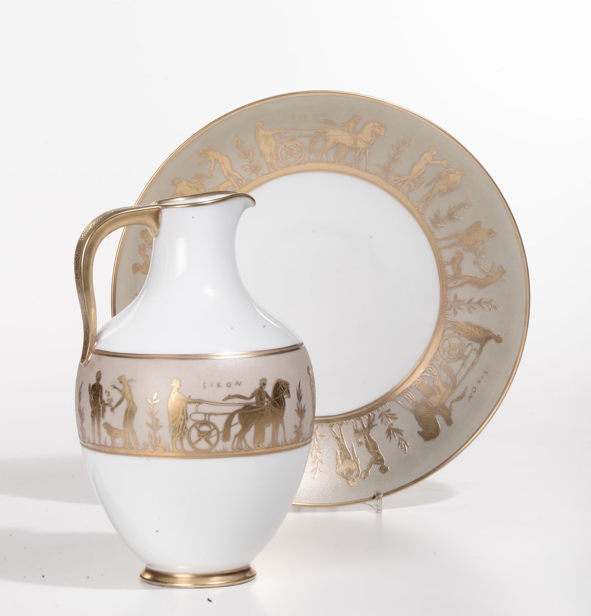 Piatto e brocca in porcellana; decori classici in oro. Sul fondo marchio della manifattura della porcellana Heinrich Bavaria, Creazioni Finzi e Finzi oro zecchino. Altezza brocca cm 30, diametro piatto cm 35,5. 1950 circa