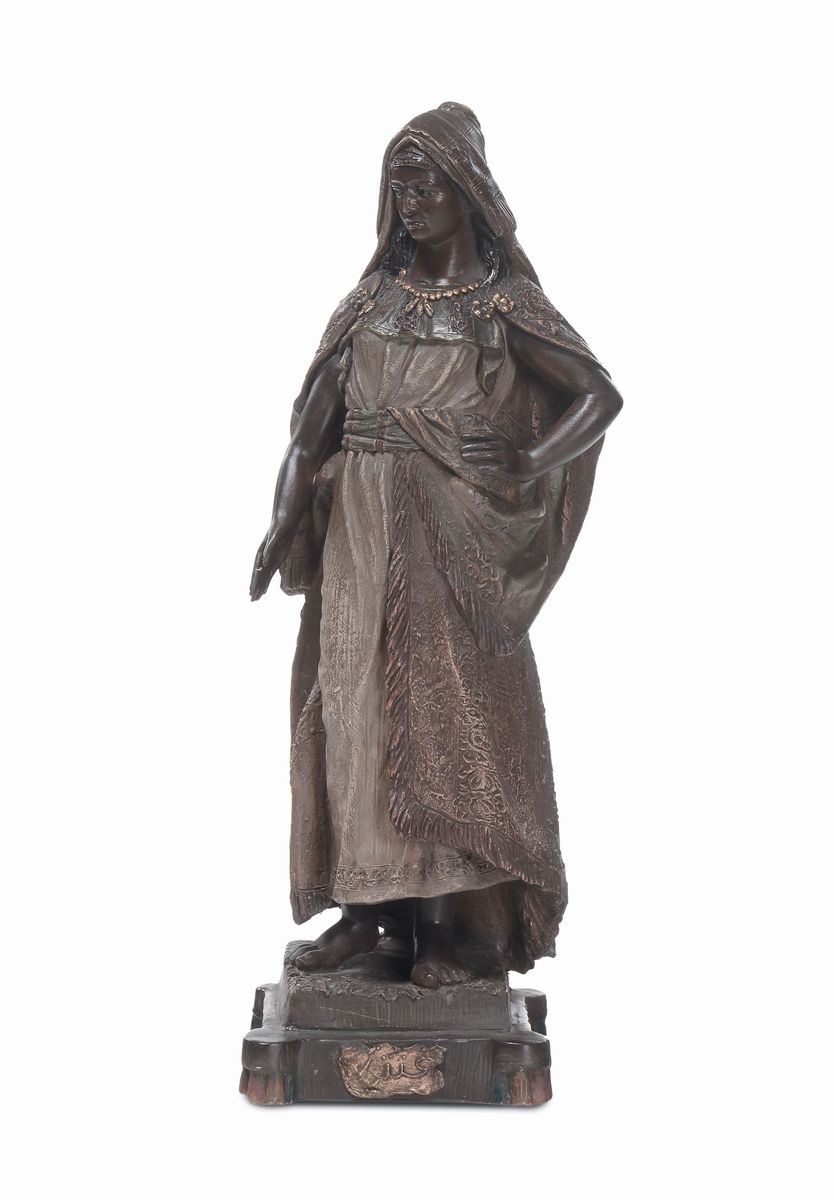 Scultura in terracotta raffigurante donna araba con abito tradizionale finemente inciso e decorato. Firma della manifattura incussa. Firma dell'autore poco leggibile. Altezza cm 37,5. 1890 circa.