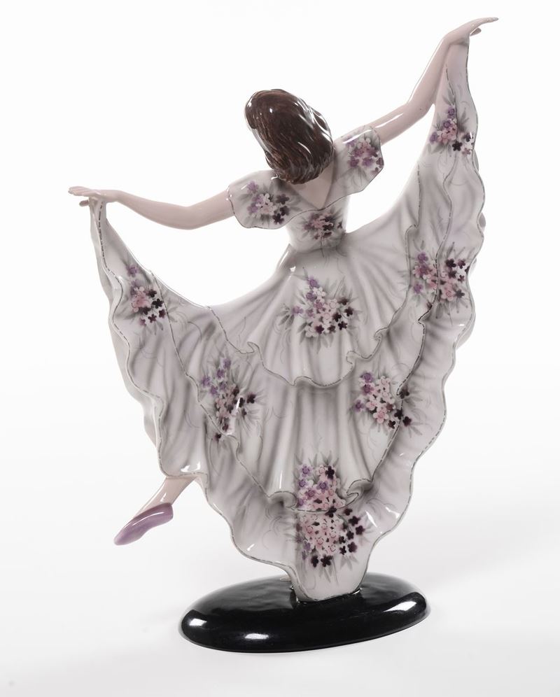Terracotta maiolicata modellata a colaggio raffigurante giovane danzatrice con ampio abito decorato con tralci di fiori rosa e viola. Sotto la base Goldscheider Wien, Made In Germany. Altezza cm 42