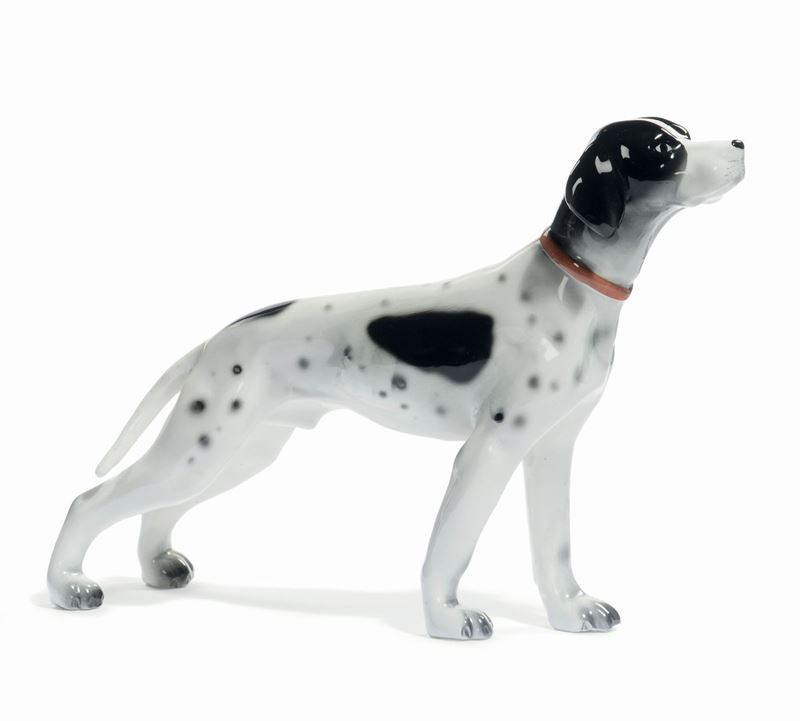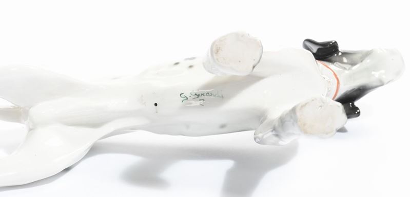 Cane da caccia in ceramica maiolicata. Altezza cm 22 lunghezza cm 30
