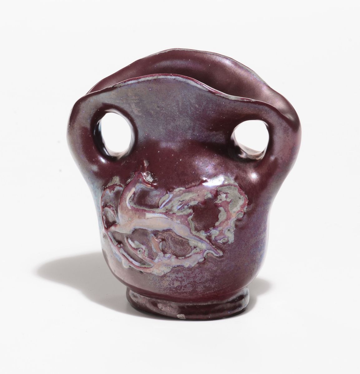 Piccola anfora in terracotta dipinta a smalti iridati con decoro in rilievo di daini. Sotto la base: Melandri Daini Faenza. Altezza cm 15