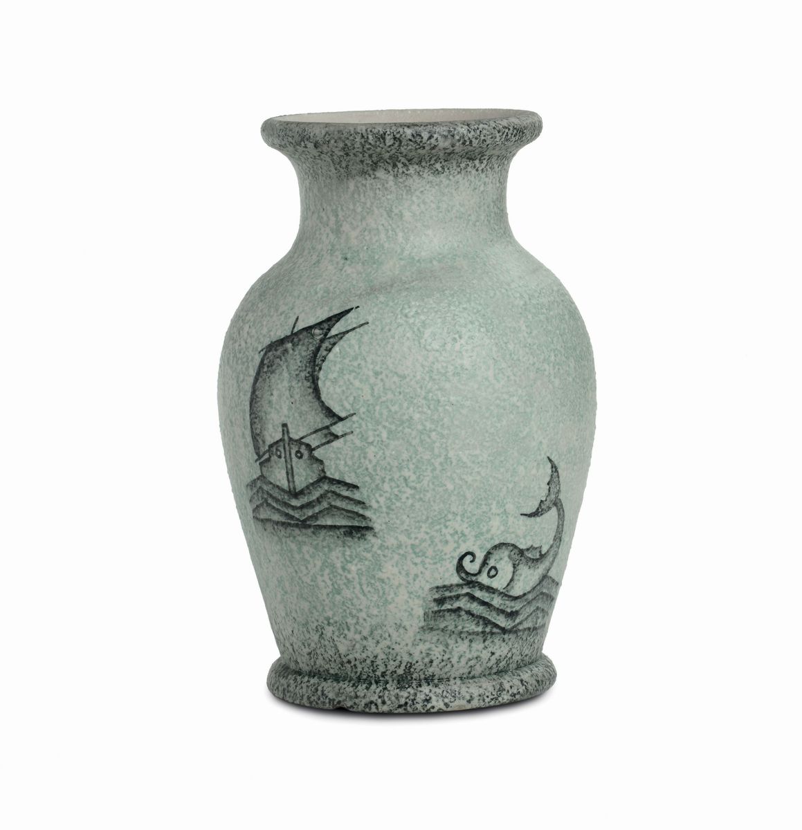 Vaso in ceramica maiolicata mat decorato all'aerografo con velieri e delfini. Altezza cm 26. 1930 circa