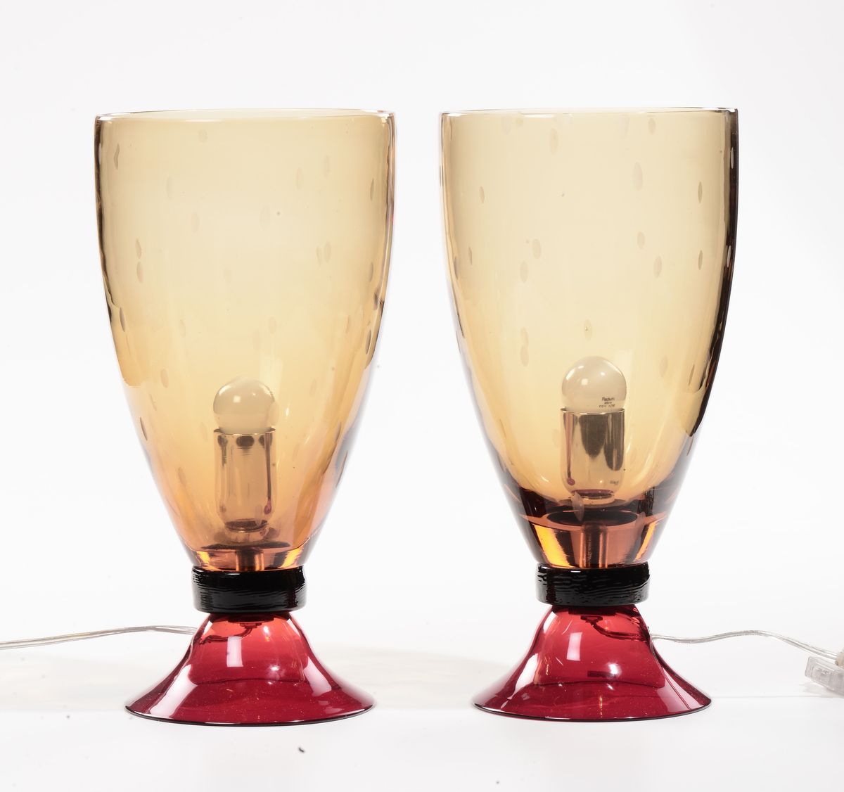 Coppia di lampade da tavolo; la base a campana è in vetro rosso, il corpo in vetro giallo ha delle incisioni a forma di goccia. Altezza cm 40. 1980 circa.