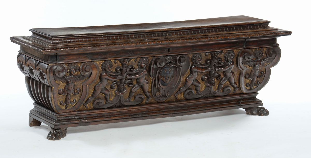 cm 192x56x69La bella cassapanca di ispirazione architettonica derivata dai sarcofagi Romani presenta un coperchio con cornici rilevate e diversi ordini di decori ad intaglio. Il corpo svasato, poggiante su piedi leonini, presenta un fronte con stemma centrale e figure di putti che reggono tralci fogliacei scolpiti a bassorilievo su fondo dorato. Sui lati ampie lesene a riserva sagomata con all'interno cariatidi alate.Fianchi con alte scanalature e fascia superiore a motivi circolari intagliati con fiore centrale.Cfr.: Furniture and interior decoration of the italian renaissance di Frida Schottmuller ed. Julius Hoffmann, Stuttgart 1928
