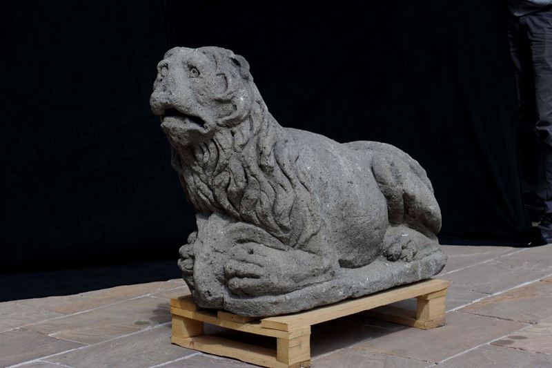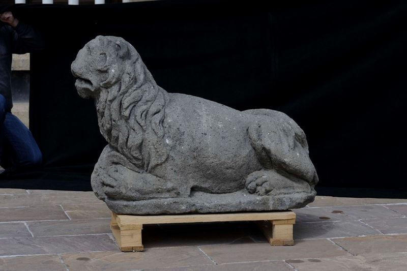 cm 114x38x77Il leone si presenta accovacciato e fisso con lo sguardo in avanti. La testa è eretta, la criniera pesante e folta, le labbra sono allargate in senso naturalistico, allo stesso modo della coda che gira sulla coscia destra. Tra le zampe anteriori il leone stringe una testa di ariete, anch'essa naturalistica. Il tronco dell'animale è grosso e tozzo, per accentuare ancora di più il senso di grandiosità della scultura.La postura del felino ed anche la presenza della testa di ariete hanno dei modelli molto chiari nella scultura funeraria romana.cfr. ad esempio il leone romano di Venosa, riutilizzato per la Fontana Angioina, o i leoni funerari di Lucera), che poi è passata ad essere simbolica nel romanico (solo per citarne uno il leone aggettante sulla facciata romanica della chiesa di San Bartolomeo a Pistoia che ha tra le zampe proprio una testa di ariete. I caratteri naturalistici dell'animale e la sua lavorazione scultorea fanno pensare che la sua datazione possa essere quella rinascimentale, epoca nella quale la schematicità e la geometrizzazione medievale vengono superata in favore di un ritorno al classico.