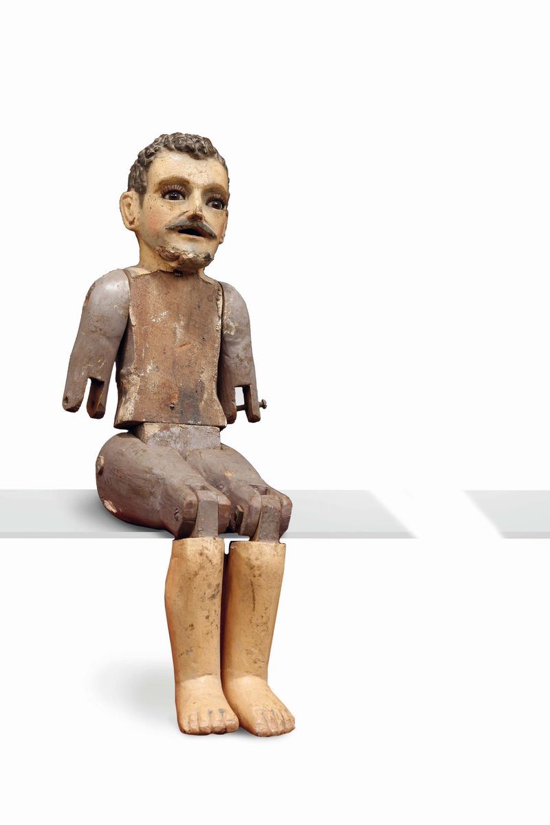 testa in legno policromo e occhi in vetro, altezza cm 49 (mancanze)