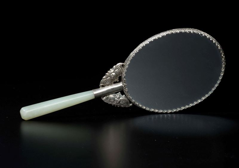 A brown jade mirror with ducks in leaves, with a jade handle and bats setting, China, Qing Dynasty, 19th century