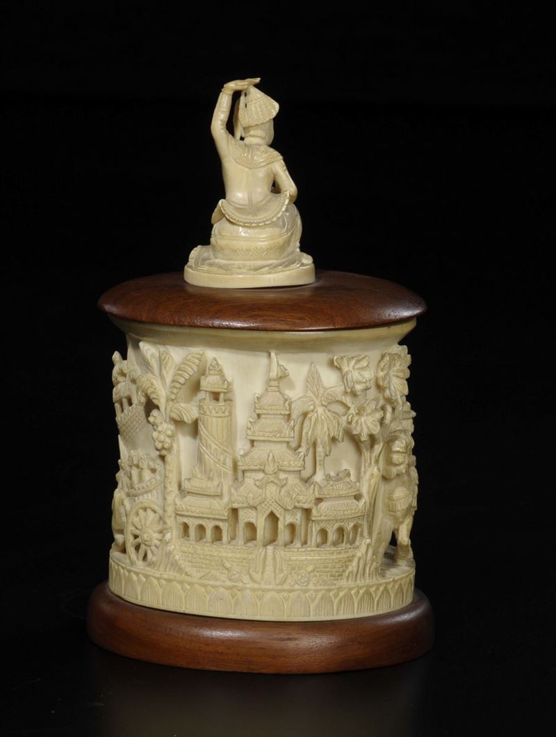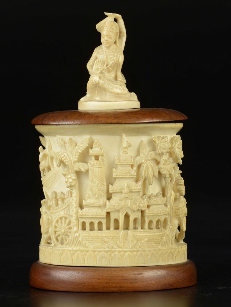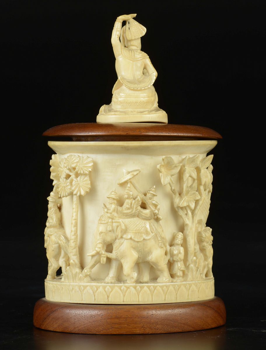 A carved ivory box and wooden cover with figures in relief, India, early 20th century