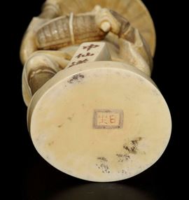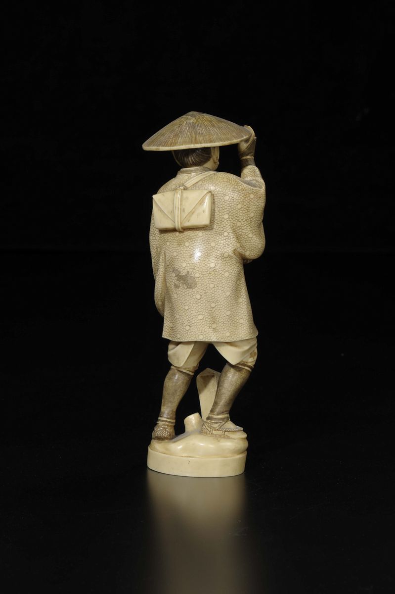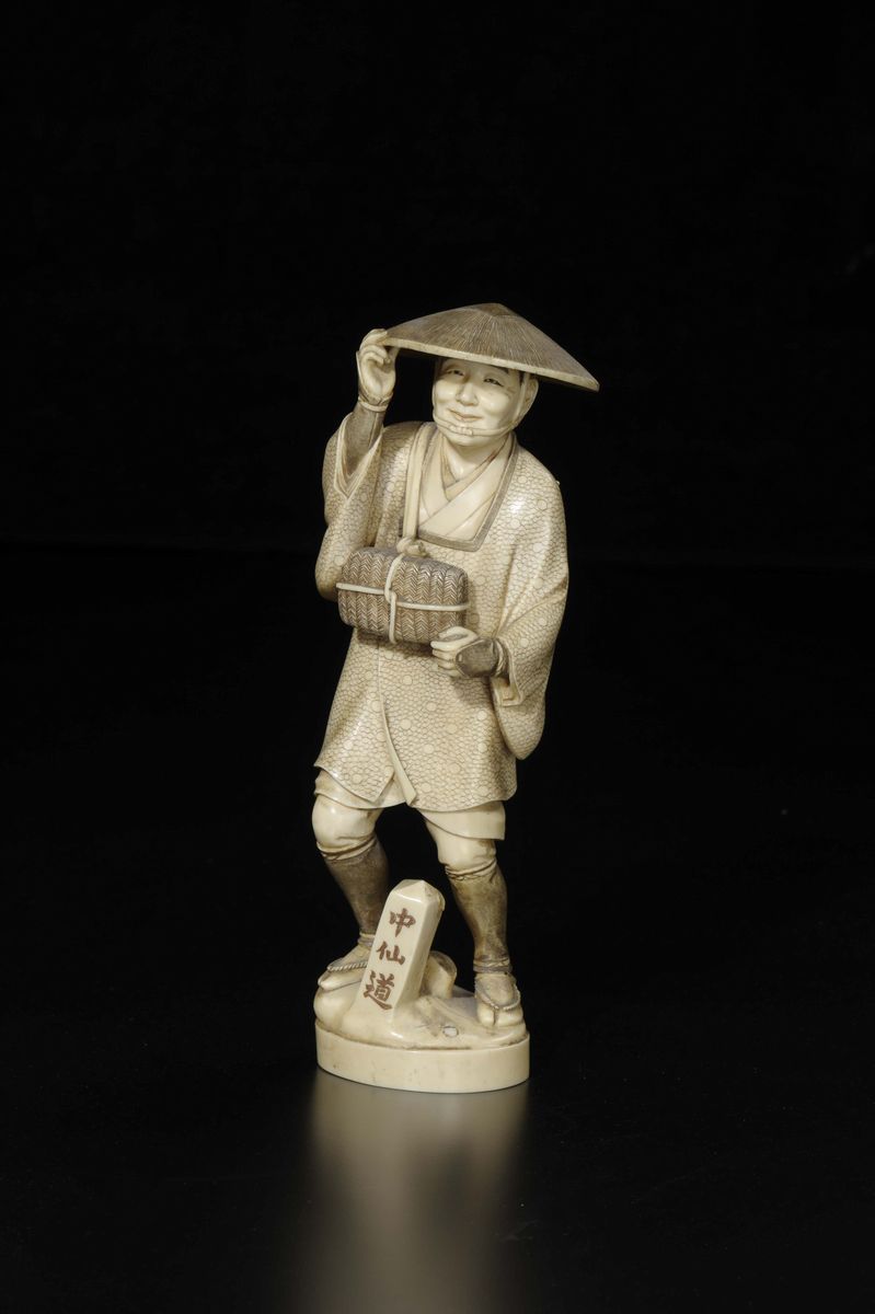 A carved ivory farmer with a suitcase wrapped in twine, Japan, early 20th century