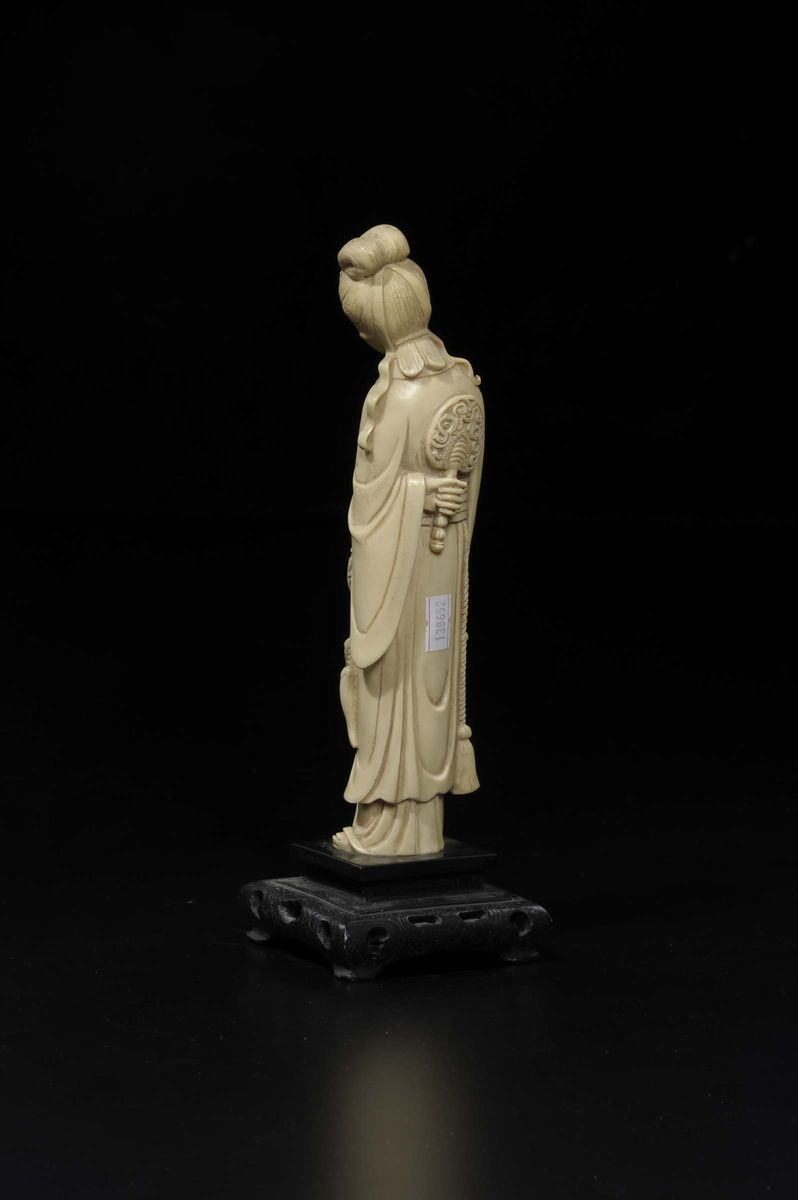 A carved ivory Guanyin with vase and fan behind her back, China, early 20th century
