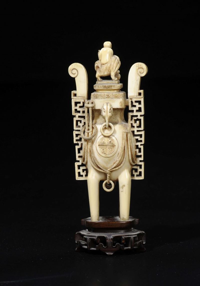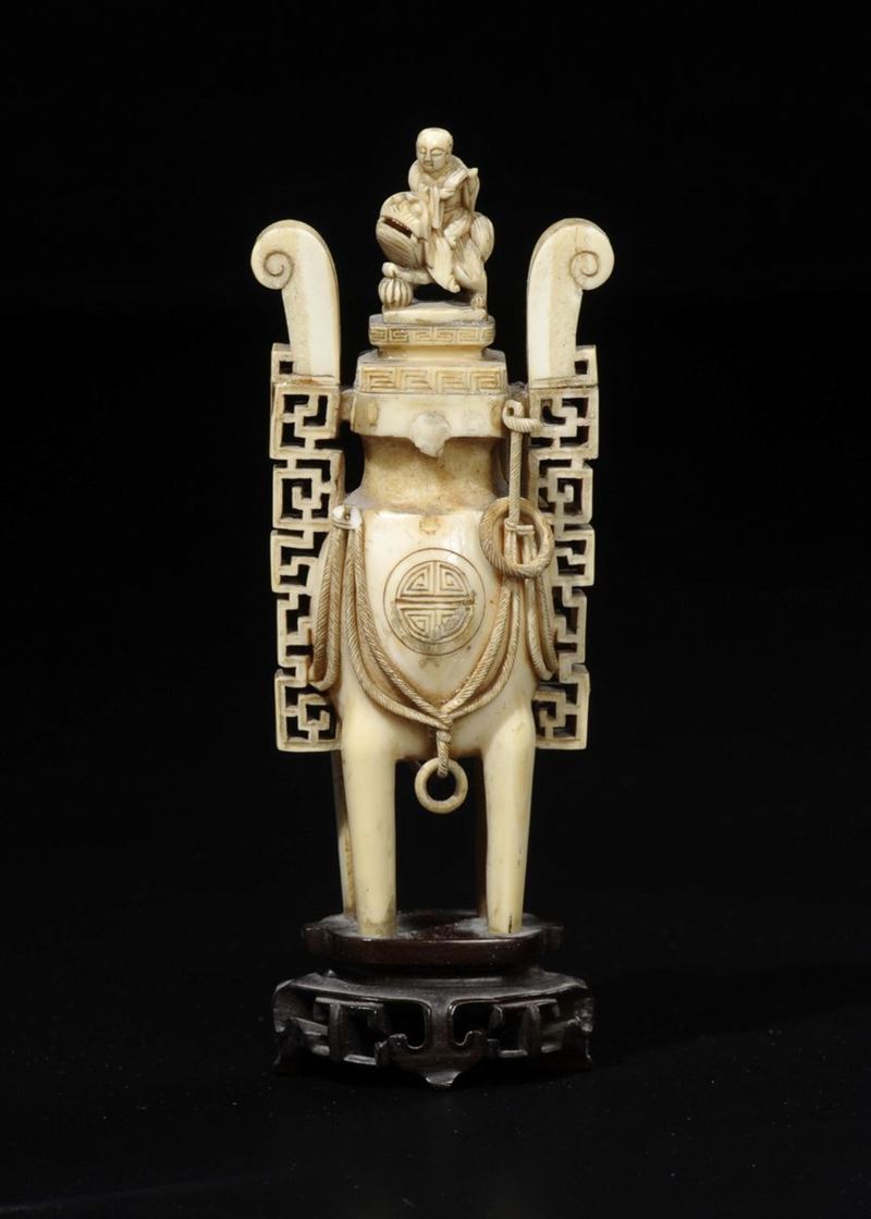 A carved ivory tripod censer and cover with wise man on Pho dog, China, early 20th century