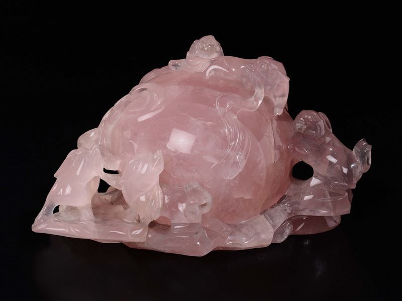 A carved rose quartz group with balls and Pho dogs, China, 20th century