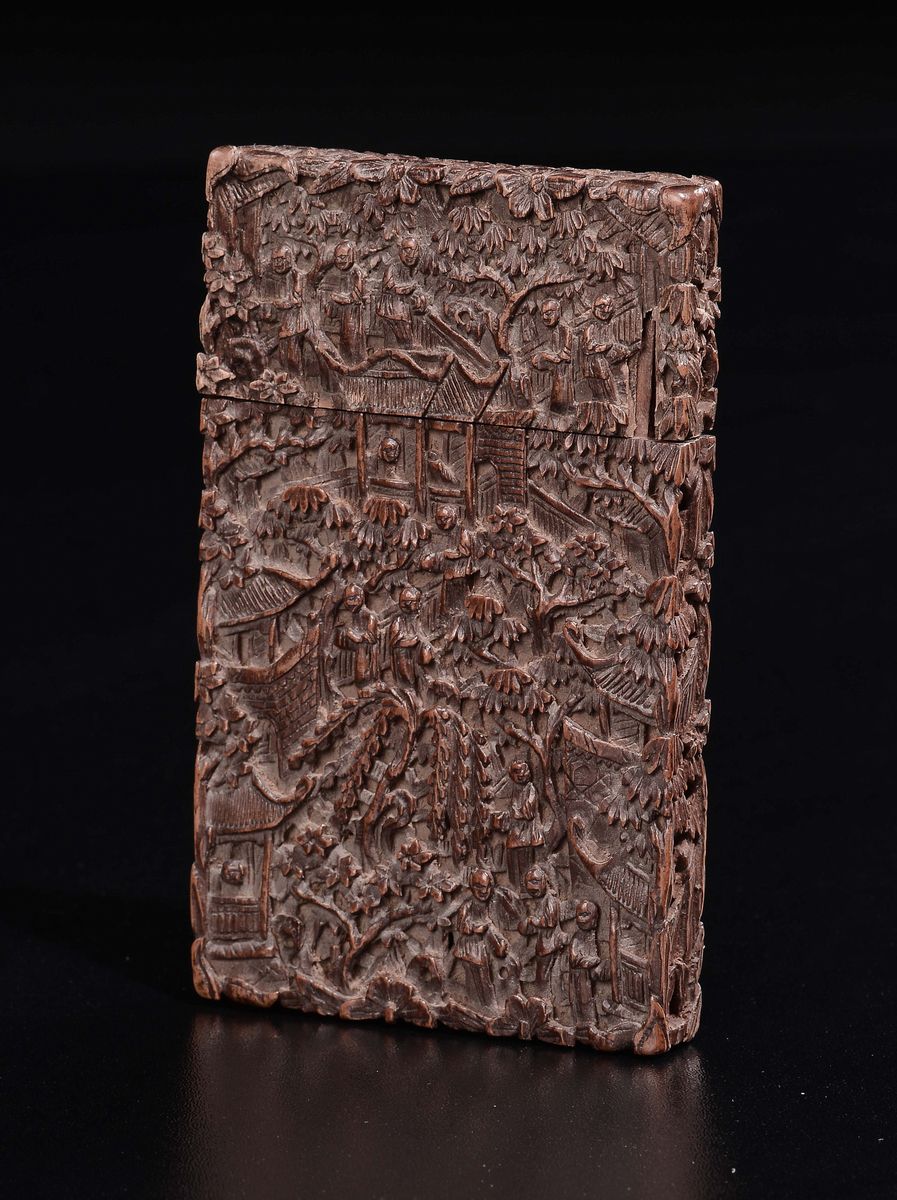 A carved wood card case with common life scenes, China, Canton, Qing Dynasty, late 19th century