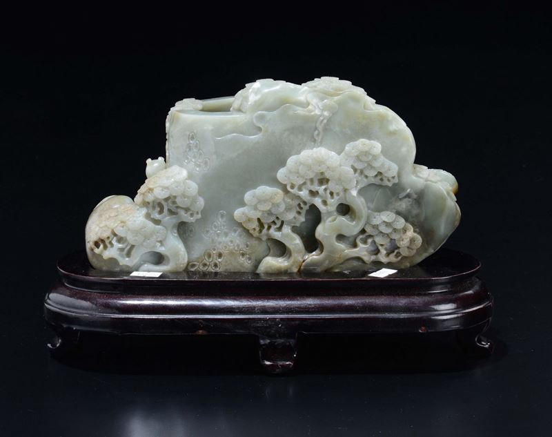 A Celadon jade brush bowl with figures and trees in relief, China, 20th century